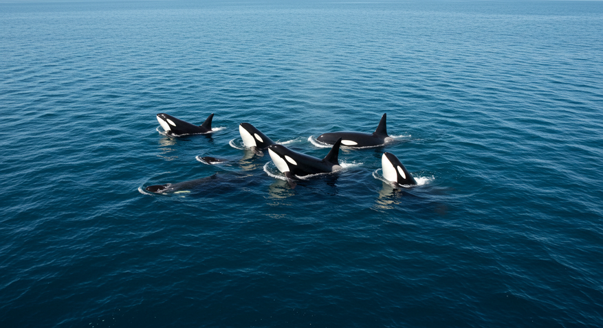 Косатки знамениты своим интеллектом. Их коммуникация включает тысячи уникальных звуков, формирующих «диалекты», характерные для каждой стаи. Они способны разрабатывать сложные охотничьи стратегии, атакуя добычу — от мелкой рыбы до китов и акул — с поразительной точностью. Например, у берегов Сахалина косатки могут выбрасываться на мелководье, чтобы схватить тюленя, или создавать волны, сбрасывая добычу с льдин. Такой уровень организации и интеллекта делает их одними из самых эффективных хищников океана.