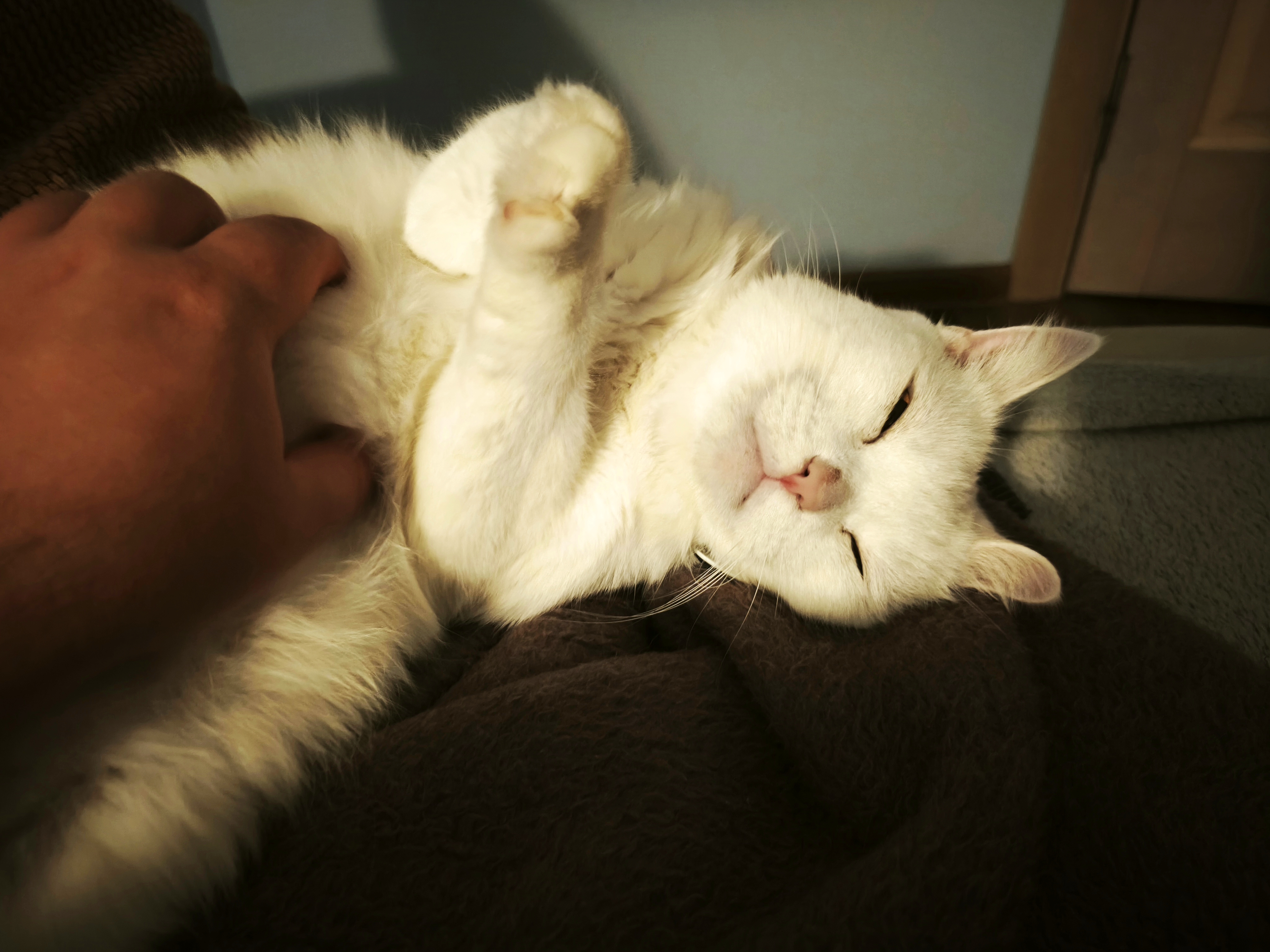 У кошек любовь к поглаживаниям уходит корнями в раннее детство. Мать-кошка вылизывает котят, стимулируя их кровообращение и дыхание, а также формируя ощущение комфорта. Во взрослом возрасте поглаживания в определённых зонах, таких, как за ушами, по спине и у основания хвоста, вызывают схожие ощущения. Мурлыканье в этом случае служит не только признаком удовольствия, но и способом самоуспокоения. При этом кошки остаются избирательными: если прикосновения кажутся им навязчивыми или неприятными, реакция может быть резко противоположной. В таком случае кошки могут начать кусаться или драться лапами. Стоит добавить, что как у котов, так и у собак особым видом доверия человеку является «разрешение» погладить животик.