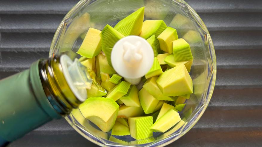 В миску с нарезанным авокадо добавляем оливковое масло, чеснок и сок половины лимона. Лимонный сок не только обогатит вкус, но и поможет предотвратить потемнение авокадо. По желанию, можно также приправить смесь солью и перцем.