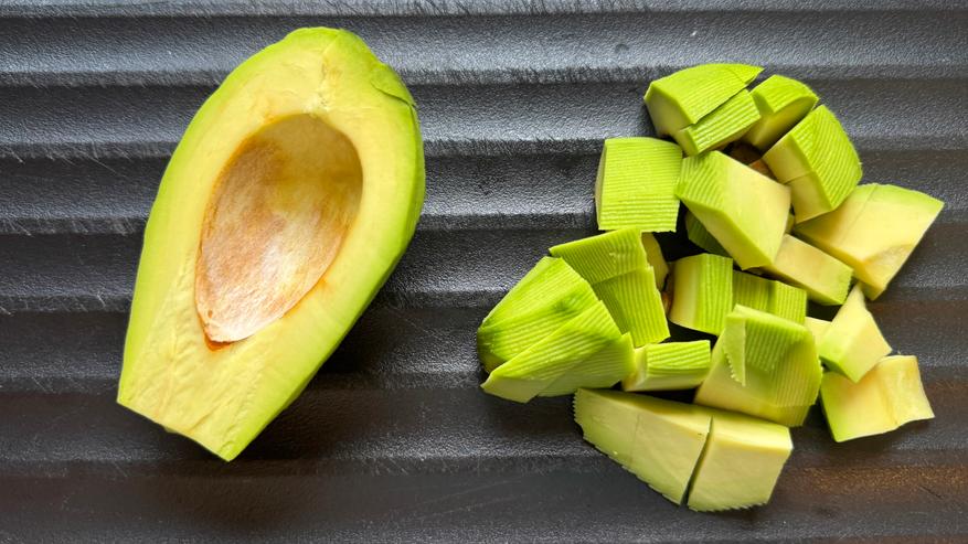 Аккуратно разрезаем вдоль авокадо и удаляем из него косточку. Извлекаем мякоть ложкой, либо можно очистить фрукт от кожуры и нарезать кубиками.