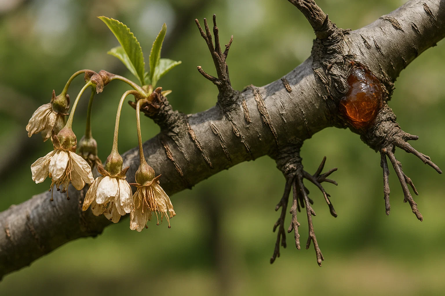 Монилиальный ожог вызывается грибами рода Monilia, которые поражают вишню, сливу, абрикос, черешню, яблоню и грушу. Грибок проникает через цветки, быстро распространяясь по побегам и плодам. Пораженные участки выглядят как обожженные: цветки буреют, листья вянут, а молодые ветки засыхают. На коре могут появляться трещины с выделением камеди, а плоды покрываются серой гнилью или превращаются в «мумии», становясь источником новых спор.