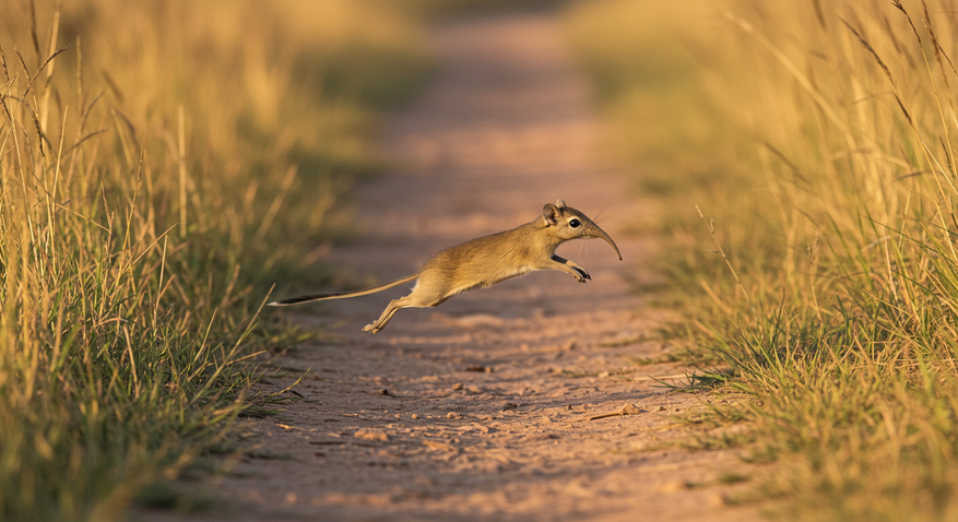 Прыгунчики обитают в самых разных уголках Африки — от засушливых саванн до густых лесов. Эти дневные млекопитающие невероятно активны: они снуют по своим территориям, выискивая насекомых, червей и мелких беспозвоночных. Их длинный, подвижный нос не только помогает находить пищу, но и служит инструментом общения — прыгунчики используют его для передачи вибраций сородичам. Особенно примечательна их манера передвижения. Благодаря мощным задним лапам они способны совершать прыжки до 30 см в высоту — впечатляющий результат для существа длиной с ладонь. Чтобы ускользать от хищников, таких как змеи или птицы, прыгунчики прокладывают в траве настоящие «автострады» — узкие тропинки, по которым они молниеносно перемещаются. Скорость этих малышей может достигать 28 км/ч, что делает их одними из самых быстрых среди мелких млекопитающих.