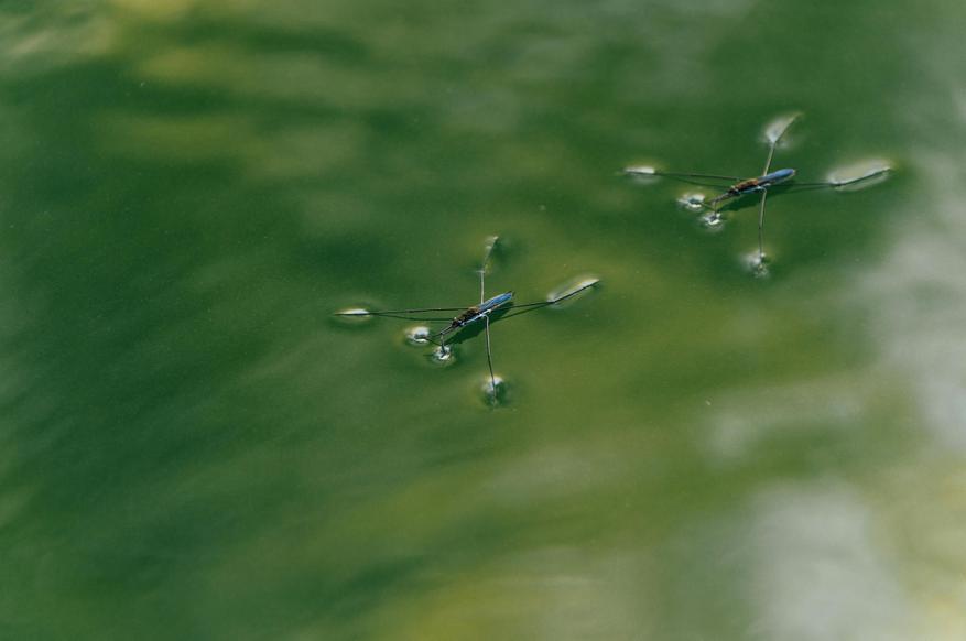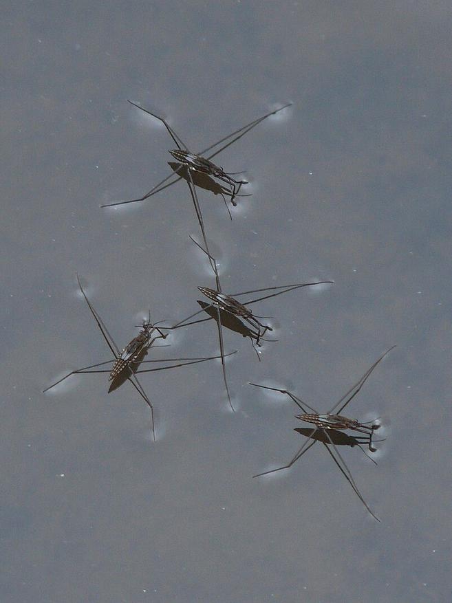 Водомерки не плавают в привычном смысле — они бегают по воде, как по твердой поверхности. Сила поверхностного натяжения воды выдерживает лёгкие объекты с большой площадью опоры, и водомерка идеально вписывается в эти условия: весит всего 2-10 миллиграммов, а лапки широкие, словно мини-снегоступы. Плюс каждая покрыта тысячами микроскопических гидрофобных волосков, которые не дают телу намокнуть и помогают держаться на плаву.