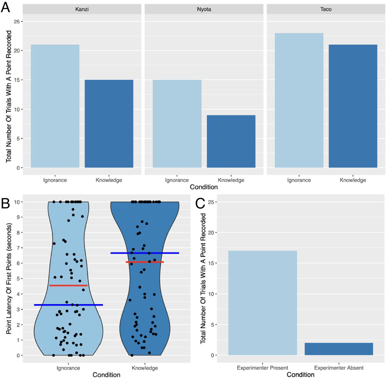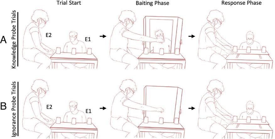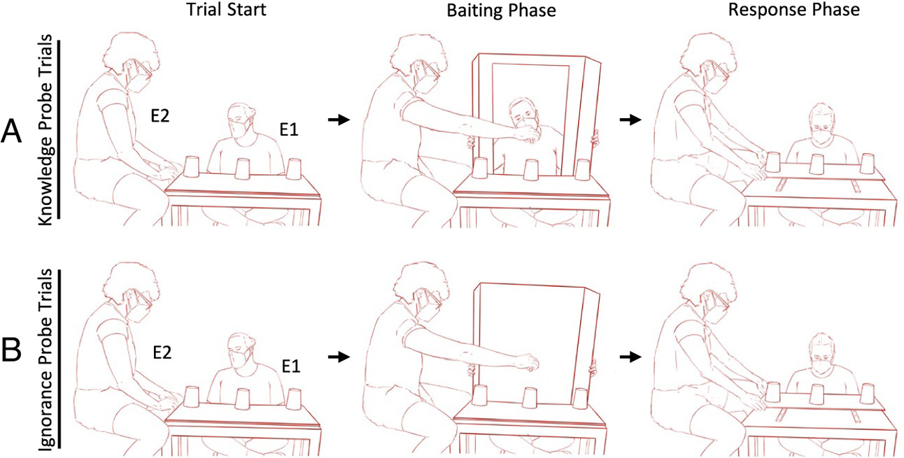 Для этого был проведён остроумный эксперимент. Бонобо наблюдали, как прячут еду под одну из трёх чашек. Затем появлялся человек, который либо видел, куда спрятали лакомство (знающий), либо не видел (незнающий). Бонобо могли указать на чашку, под которой находилась еда.