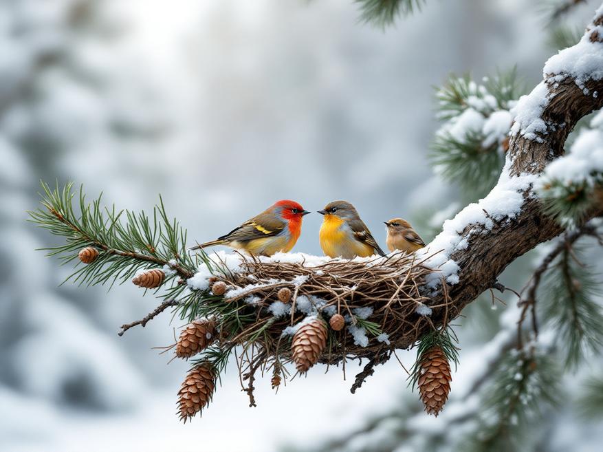 У клестов есть ещё одна удивительная особенность — они могут выводить птенцов даже в самые суровые зимние морозы, когда температура опускается до -20 °C. Это настоящий родительский подвиг! Связано это с тем, что семена хвойных растений созревают достаточно поздно, и клёсты могут размножаться в тот момент, когда у них появляется богатый источник пищи.