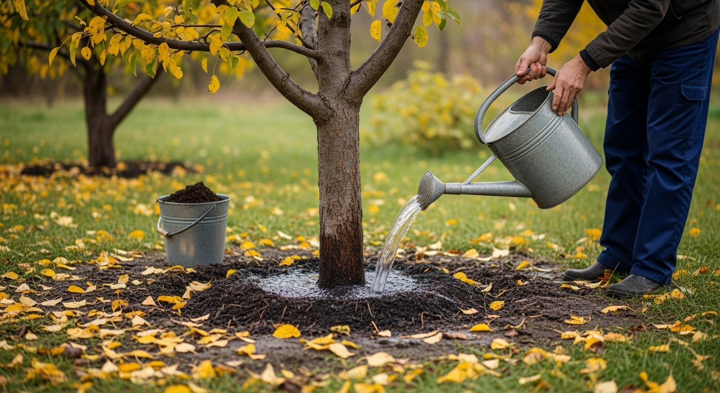 Влагозарядный полив необходим, особенно в засушливую осень, чтобы корни не страдали от обезвоживания. Перед наступлением заморозков, в октябре или начале ноября, тщательно увлажните почву, расходуя 50-100 литров воды на квадратный метр для взрослых деревьев и 25-40 литров для саженцев. Воду подавайте небольшими порциями, чтобы она глубоко пропитала грунт. После полива укройте приствольные зоны слоем органического материала — перегноя, сосновой коры или торфа — толщиной 8-12 см, чтобы сохранить тепло и влагу.