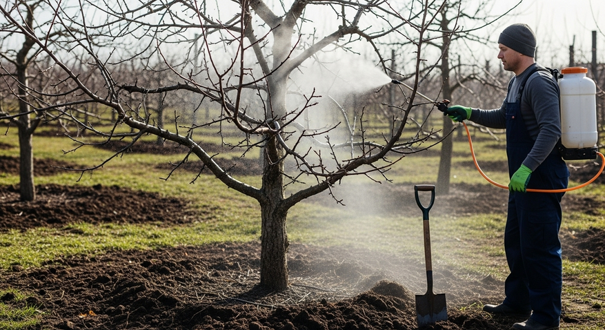 Осень — подходящее время для защиты сада от грибков и насекомых, которые могут перезимовать в коре, почве или растительных остатках. После листопада обработайте деревья и приствольные круги защитными составами. В сухую погоду при температуре выше +5 °C опрыскайте кроны и грунт 3%-ным раствором бордоской смеси или сульфата железа (300 г на 10 литров воды). Эти препараты эффективно борются с возбудителями парши, коккомикоза и других грибковых инфекций. Для усиленной профилактики используйте раствор карбамида: 600 г на 10 литров воды для ветвей и 1,2 кг для почвы.