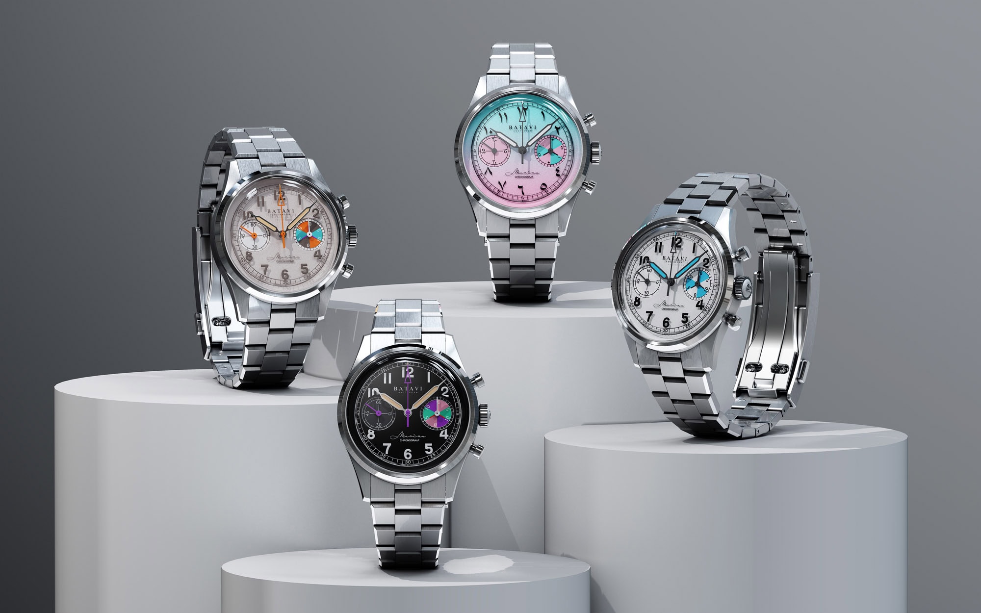 Амстердамский бренд Batavi выпустил коллекцию Marina Chronograaf, в которой четыре версии — Sunrise, Mist, Sand и Night. Отличаются они в основном оформлением циферблата. Sunrise получил плавный переход от розового к синему и арабские цифры восточного стиля. Mist выполнен в бело-синих тонах, Sand — в мягких оранжевых и коричневых оттенках, а Night сочетает тёмный фон с фиолетовыми и мятными акцентами.