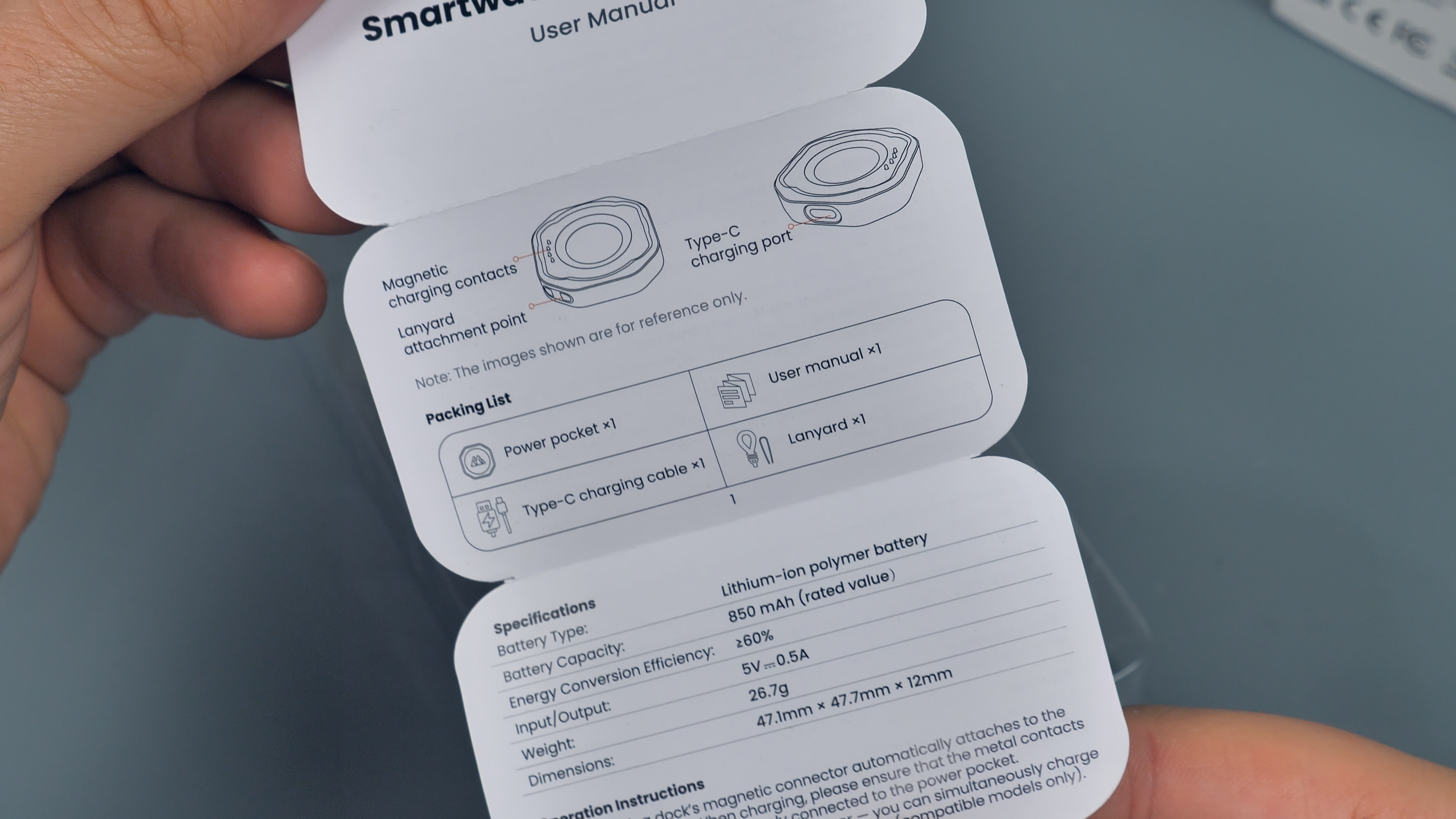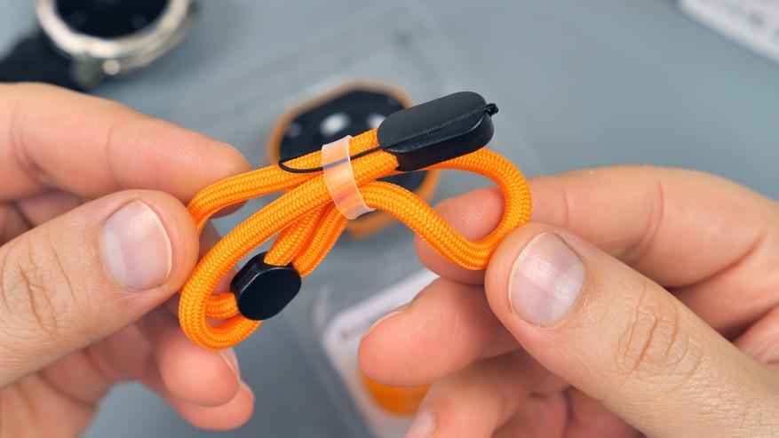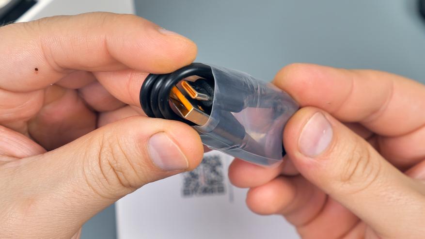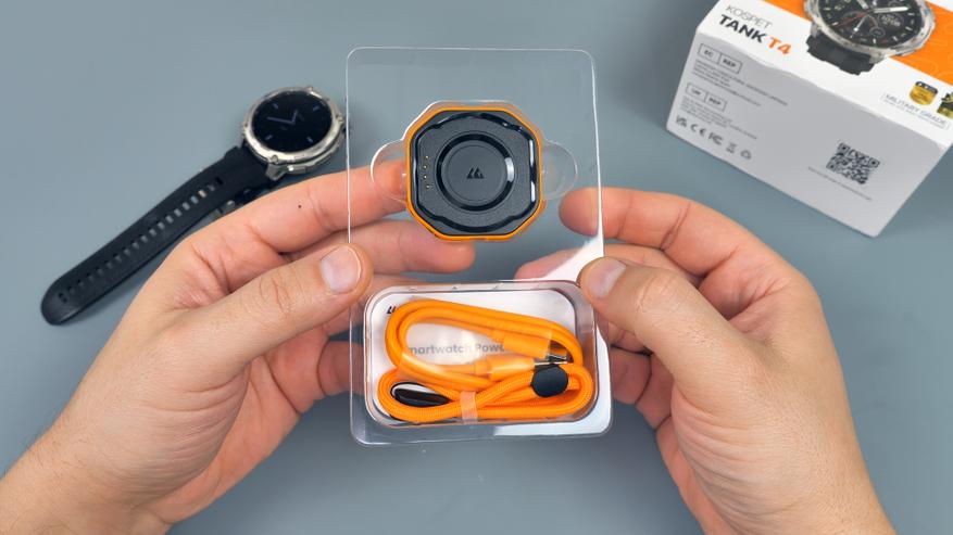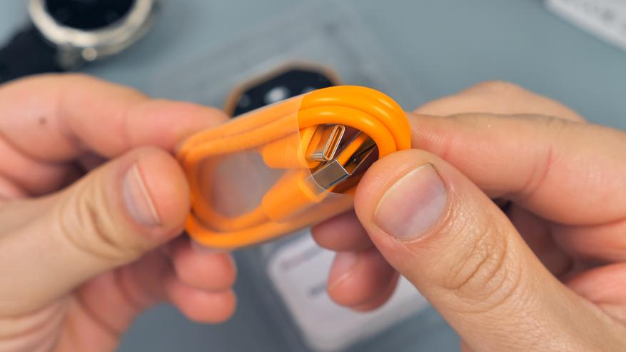 У автономной зарядной базы в комплекте есть темляк оранжевого цвета для переноски на запястье, USB Type-C кабель оранжевого цвета и краткая инструкция пользователя.
