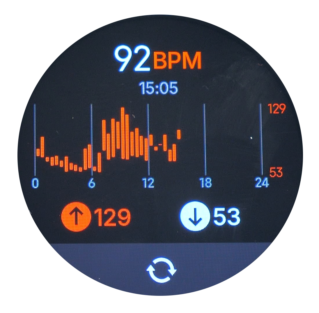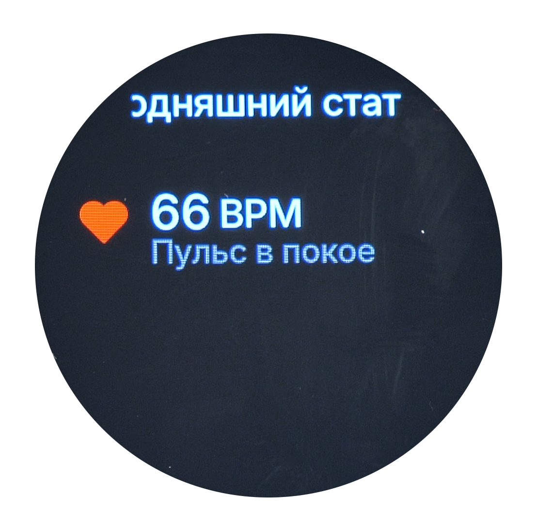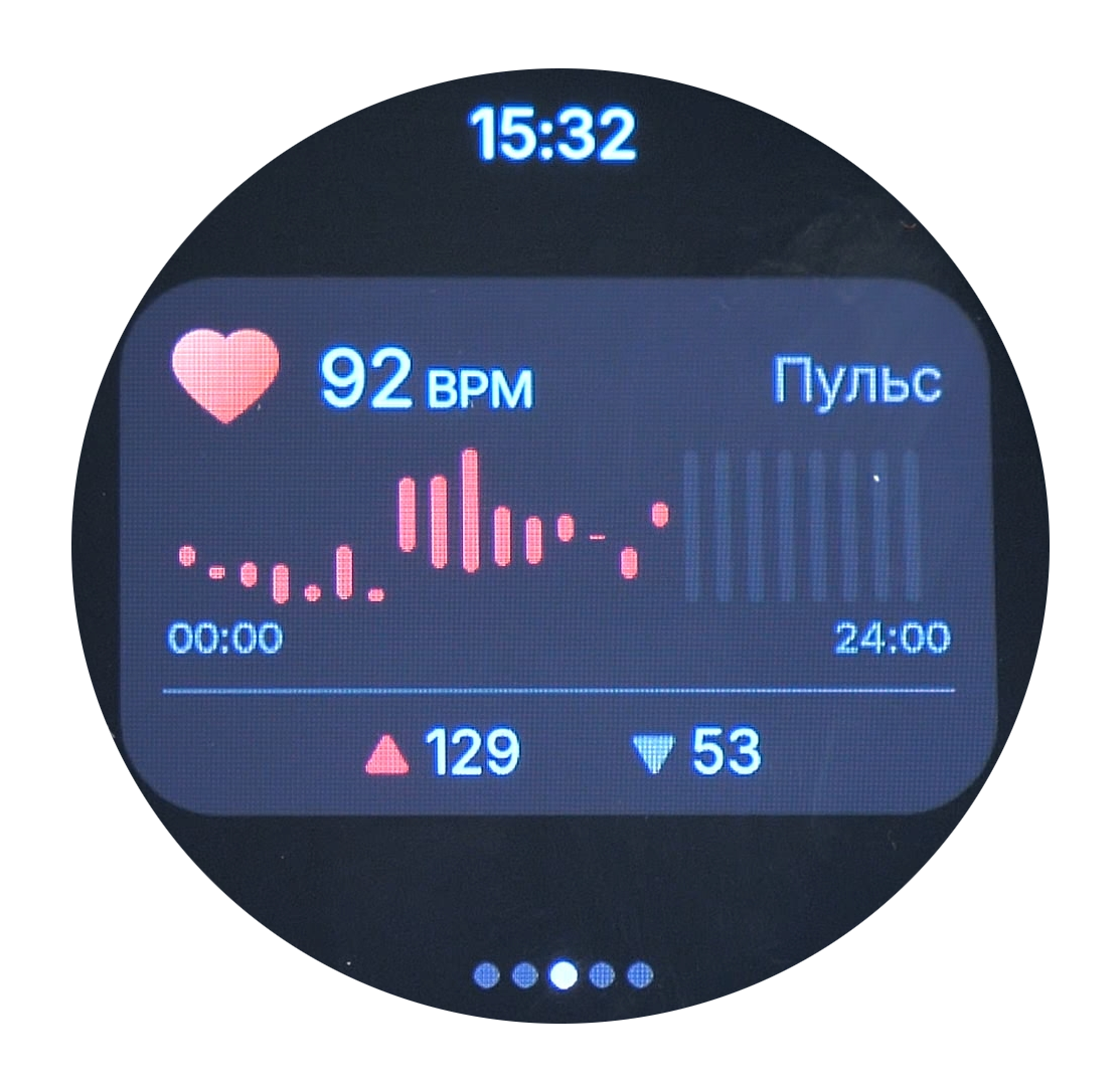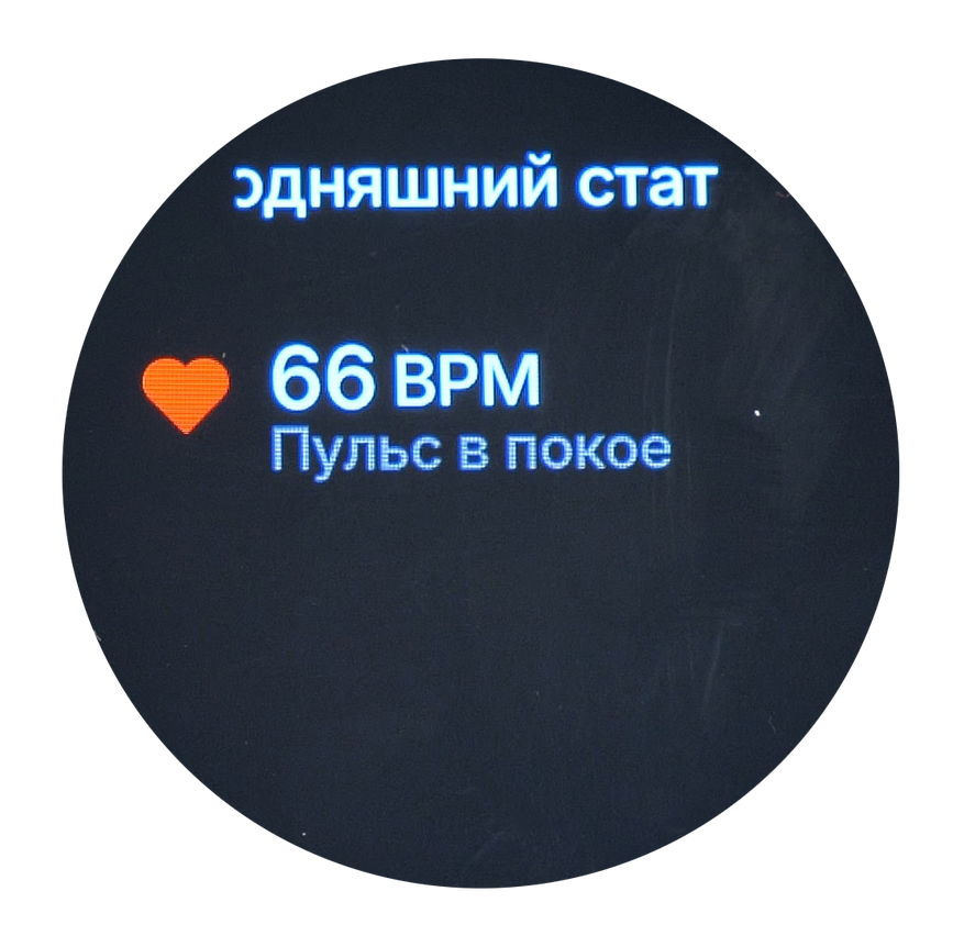 Также отображаются данные о состоянии здоровья пользователя, главным показателем которых является сердечный ритм (пульс). Информация доступна в двух форматах отображения: текущие значения пульса в реальном времени и суточная статистика. В статистике за день отражаются три ключевых параметра: максимальный пульс, минимальный пульс и пульс в состоянии покоя.