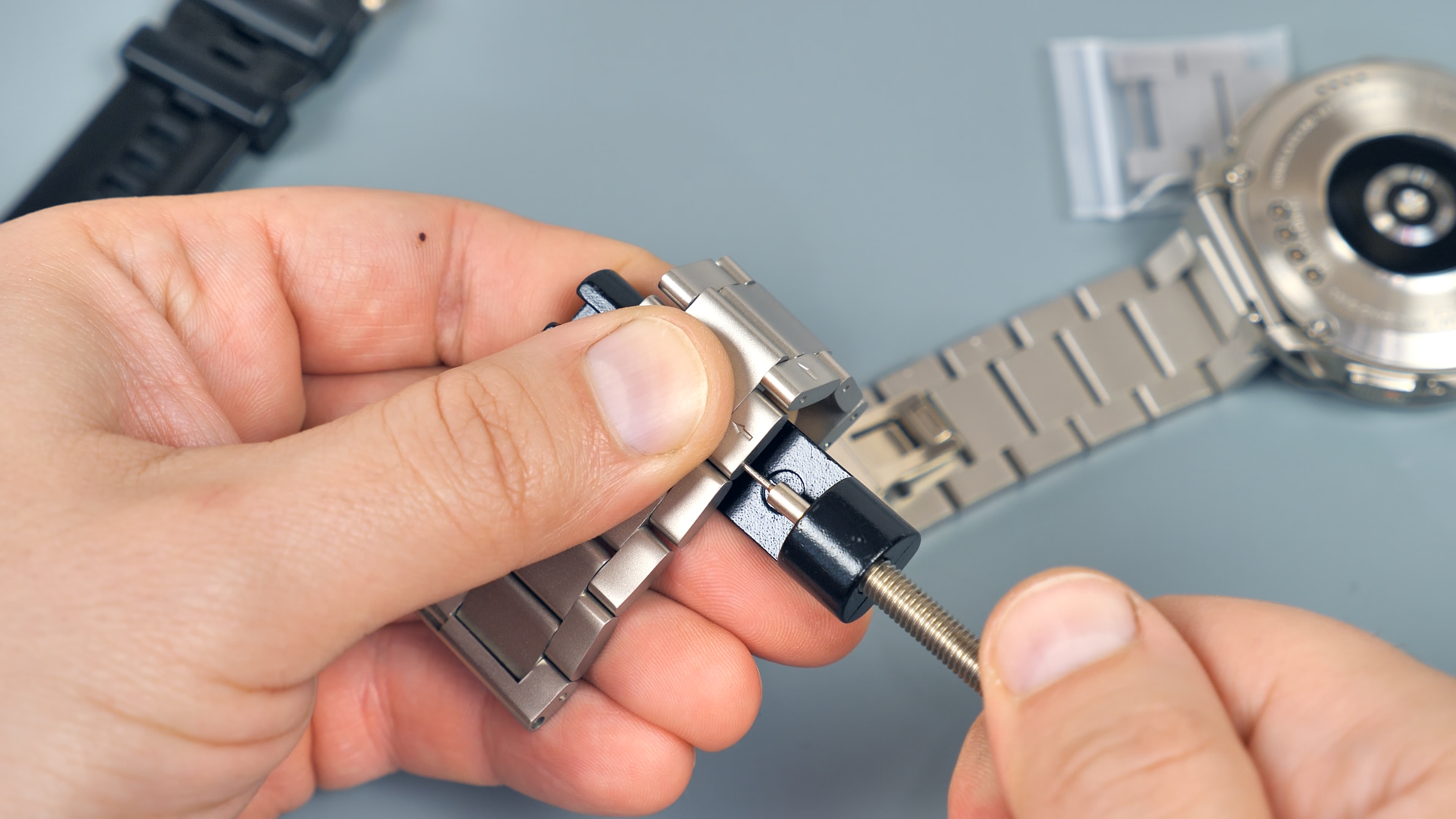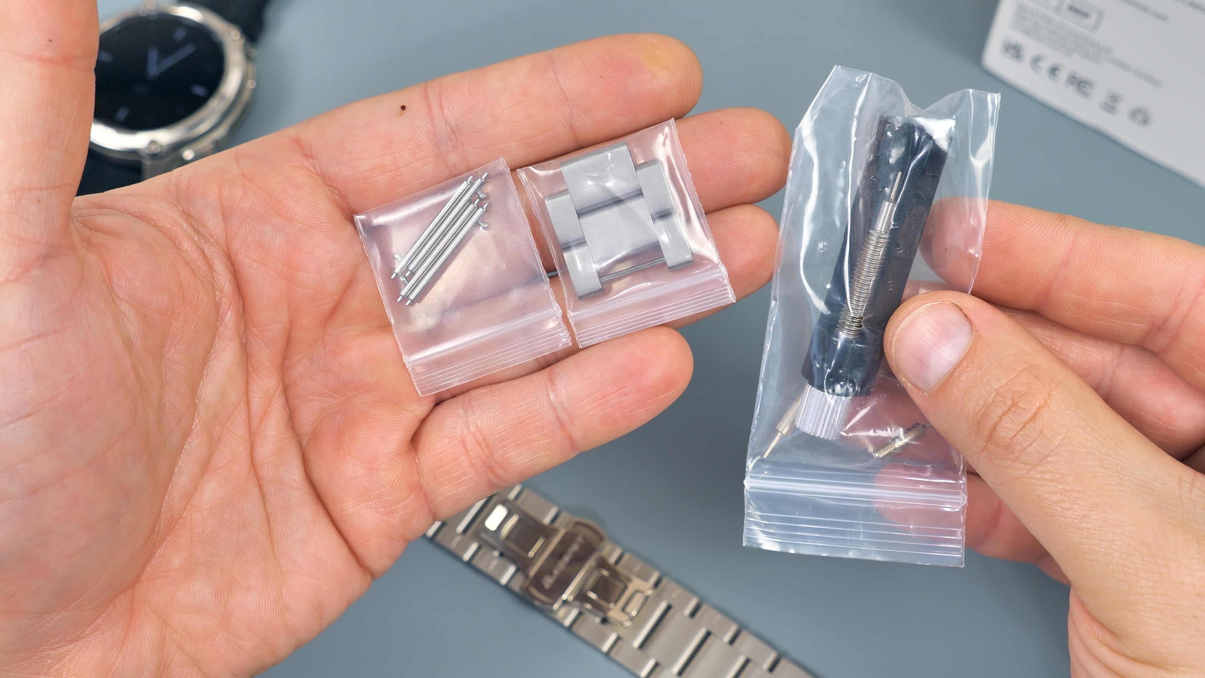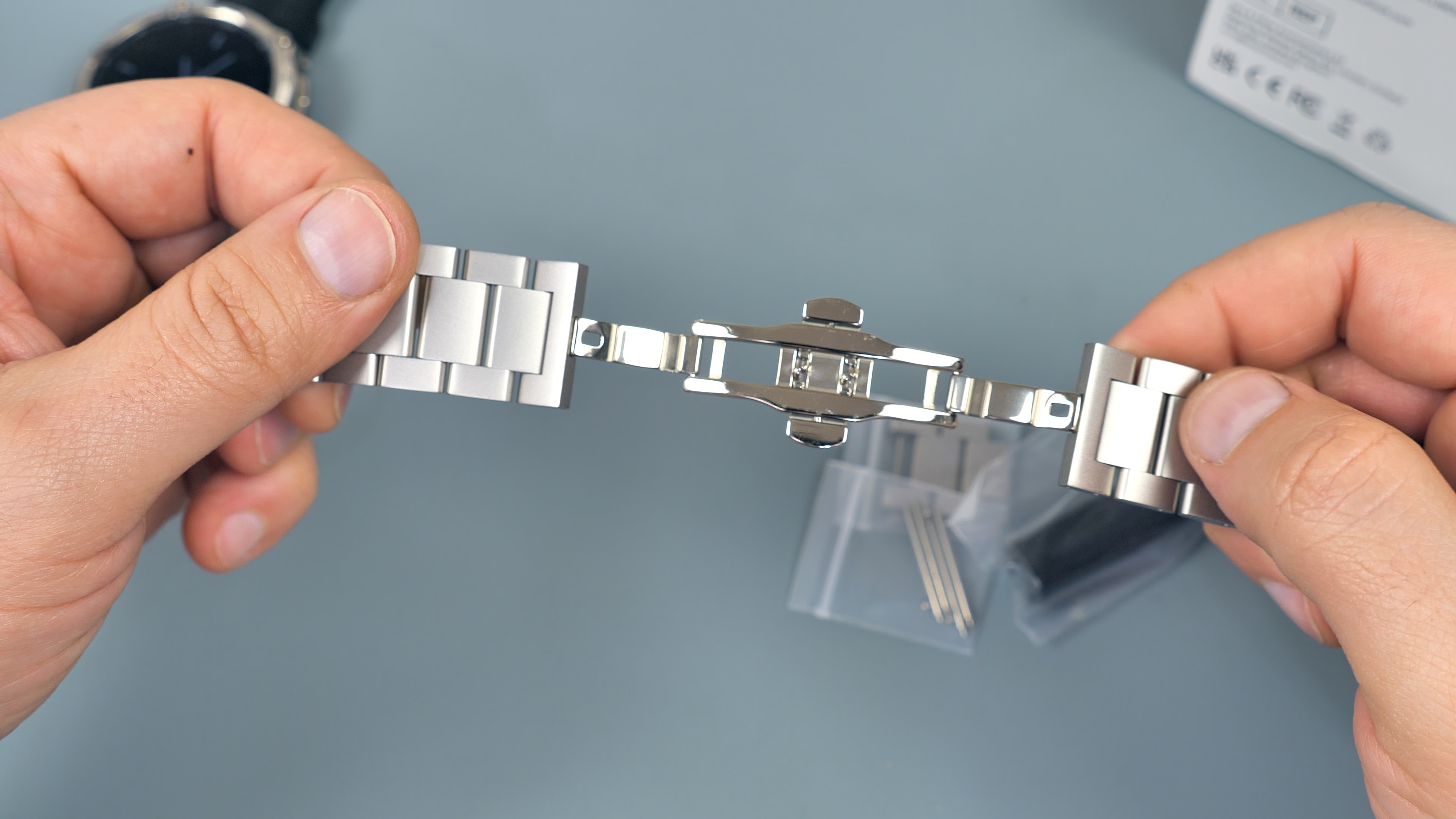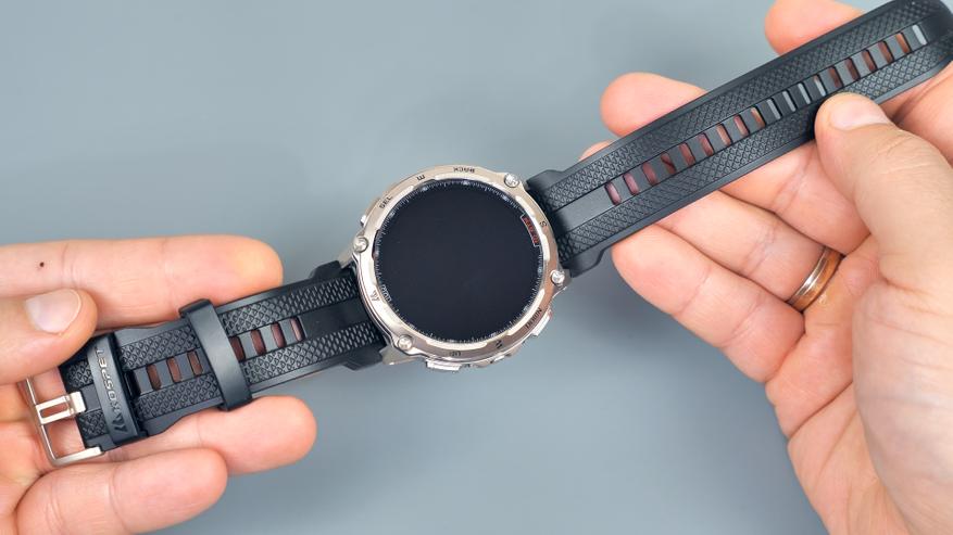 В часах используется популярный размер ремешков — 22 мм. Штифты подпружиненные, извлекаются и устанавливаются без какого-либо инструмента. Что касается металлических ремешков, они имеют застёжку-бабочку. Производитель поставляет их вместе с выжимкой для укорачивания при необходимости.