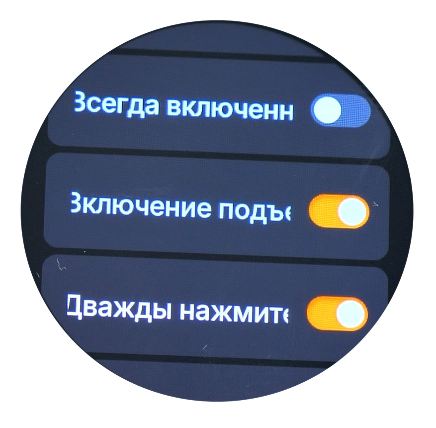 В настройках предусмотрена возможность ручной установки даты и времени при отсутствии подключения к смартфону, а также настройки формата их отображения. Особенно полезной является функция автоматической регулировки яркости дисплея, которой не было в предыдущих моделях, — при этом сохраняется возможность ручной настройки уровня яркости. Управление дисплеем предлагает несколько удобных опций: можно настроить его включение взмахом запястья или установить режим постоянного отображения. Дополнительно доступны функции пробуждения экрана двойным касанием и выключения путём закрытия его ладонью.