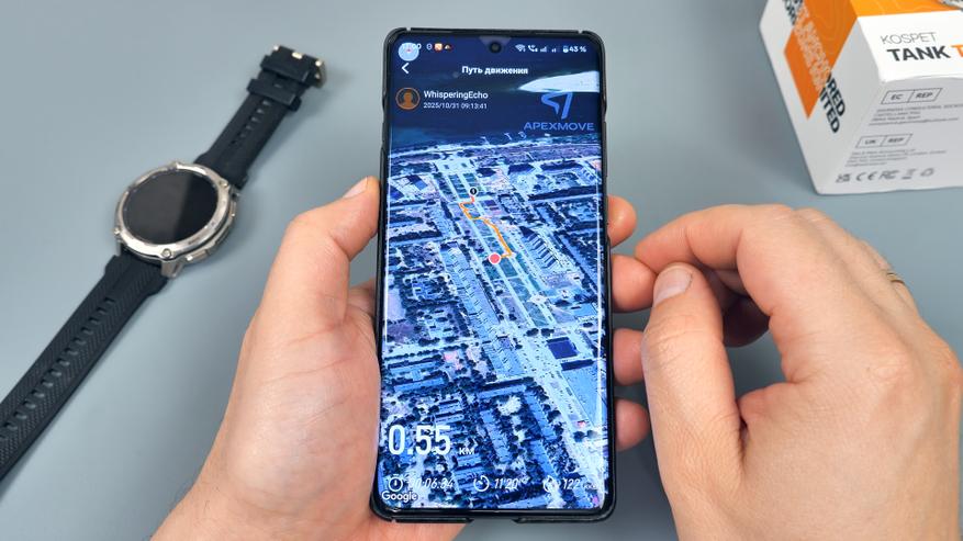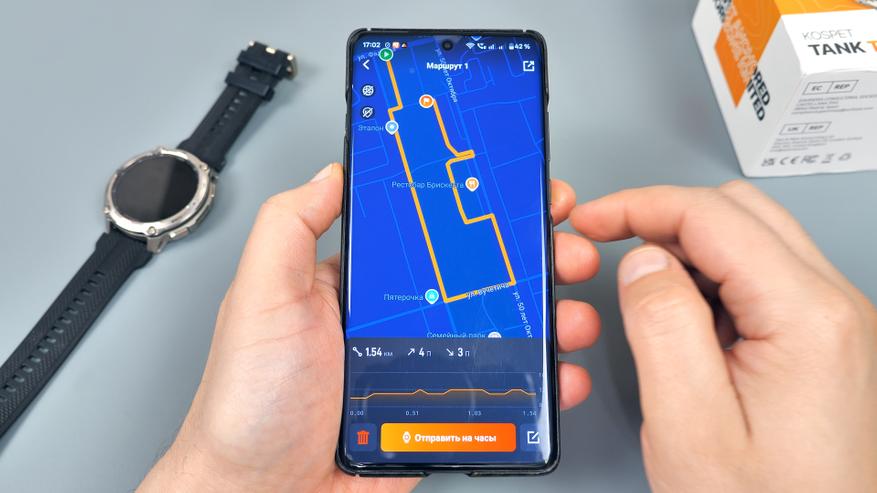 Маршрут записывается самими часами и параллельно может отображаться в приложении на смартфоне, что обеспечивает удобство отслеживания показателей и анализа пройденного маршрута.