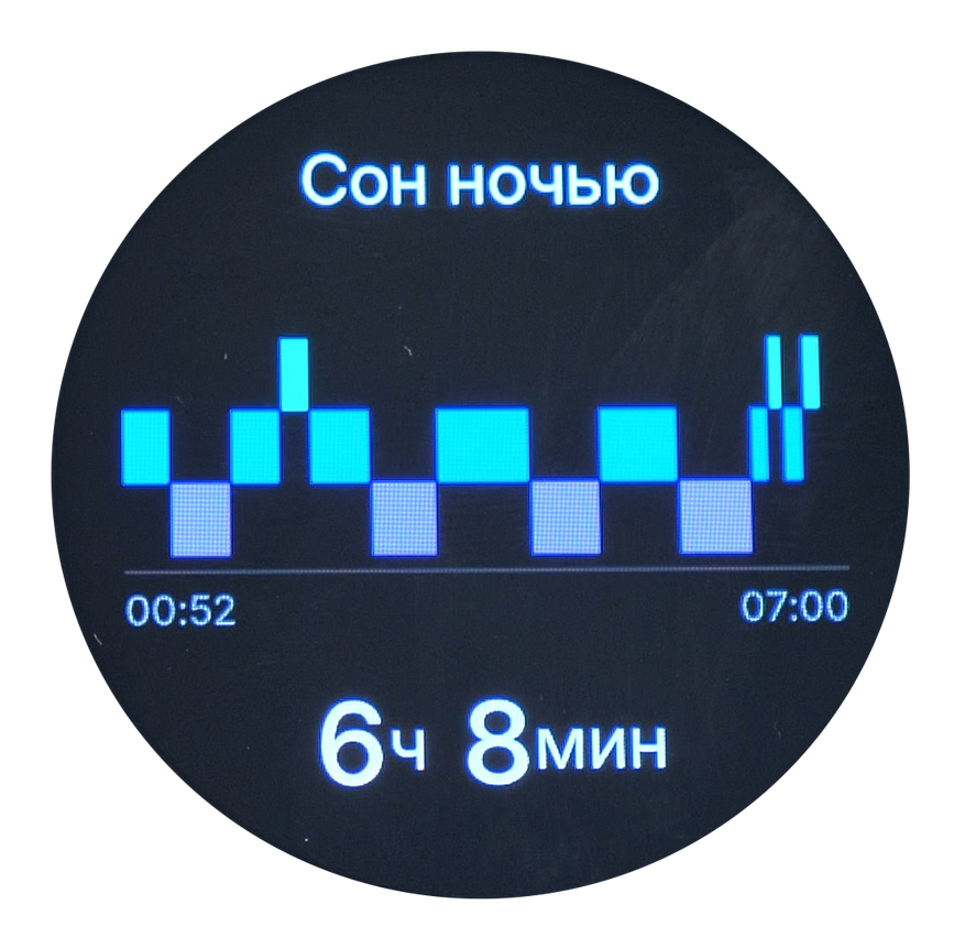 Имеется информация о сне, включающая данные о его продолжительности и разбивке по фазам