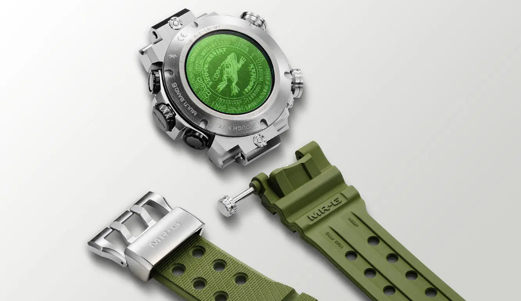 Ремешок выполнен из прочного фторкаучука Dura Soft цвета хаки с оранжевыми вставками. По заявлению производителя, он обеспечивает комфортную и надёжную посадку, адаптируясь к движениям руки. Благодаря специальной модульной конструкции крепления замена ремешка осуществляется быстро и просто — без использования инструментов. Пряжка выполнена из титанового сплава, что делает её одновременно лёгкой и прочной.
