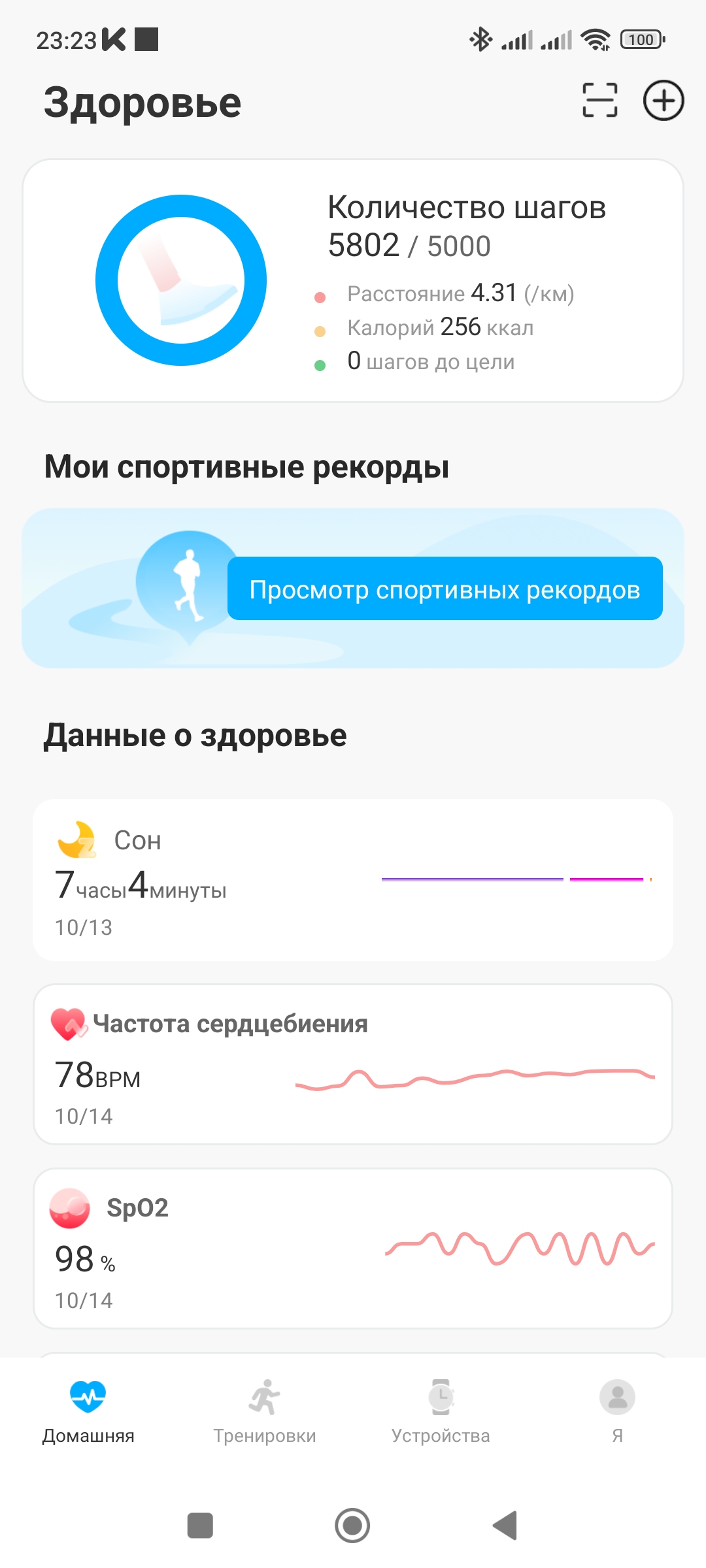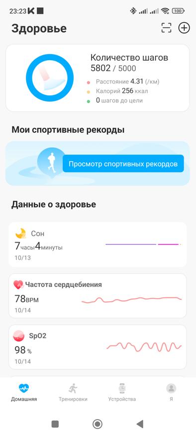 Главная страница включает информацию о здоровье и физической активности. Вторая вкладка — тренировки, здесь доступны 4 основных спортивных режима, с интерактивной картой и построением маршрута. А через интерфейс самих часов доступны целых 111 режимов.