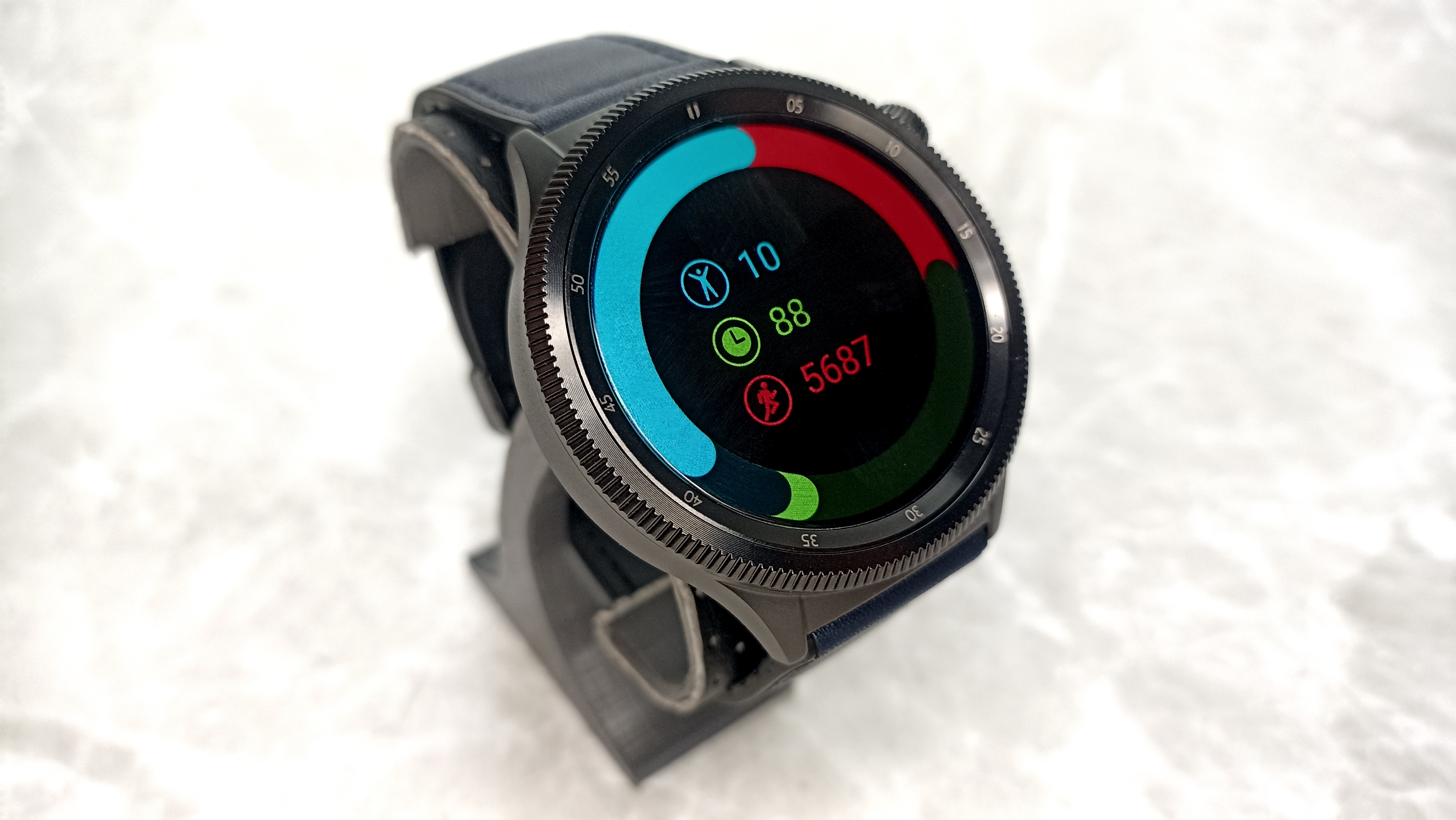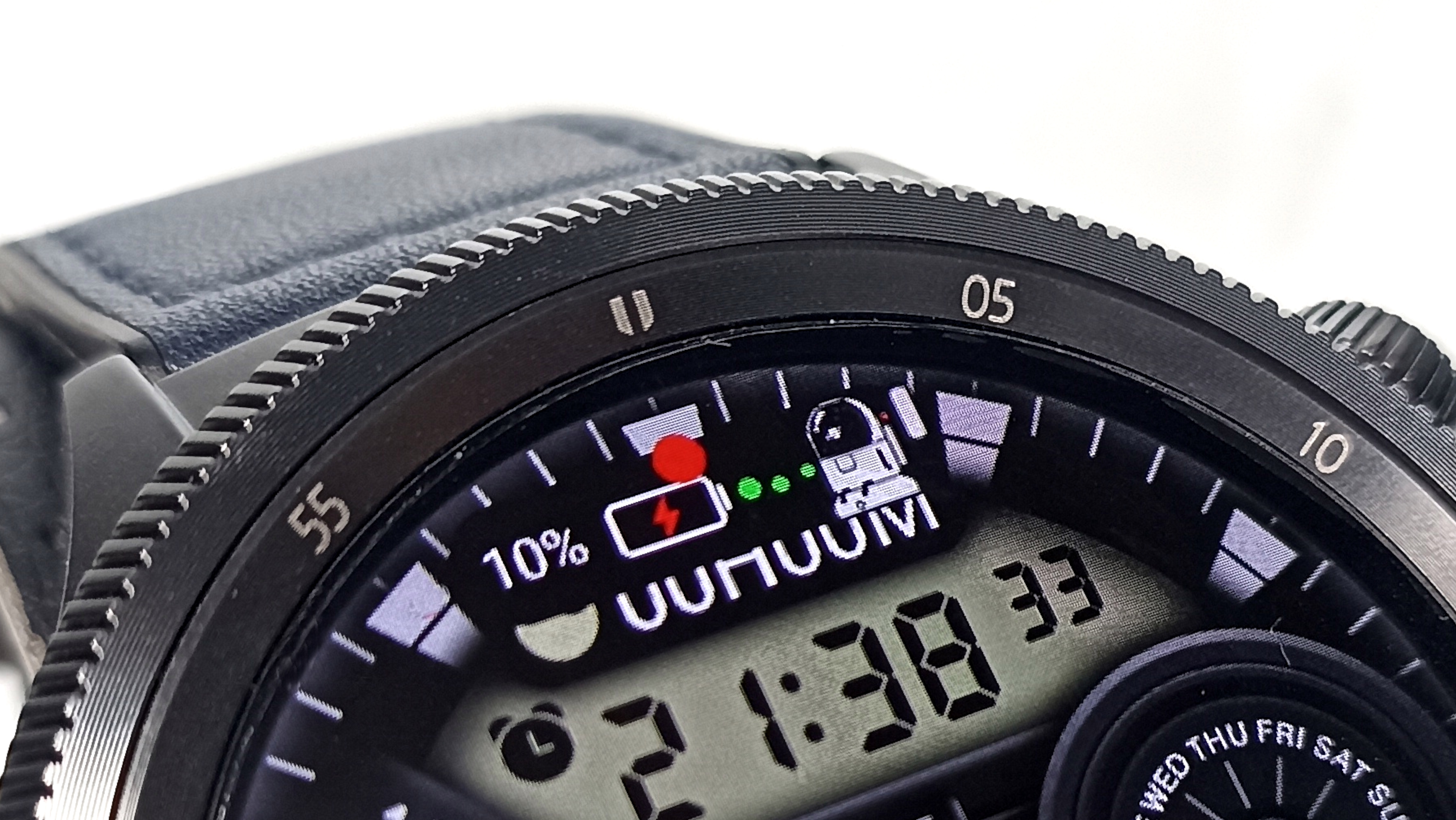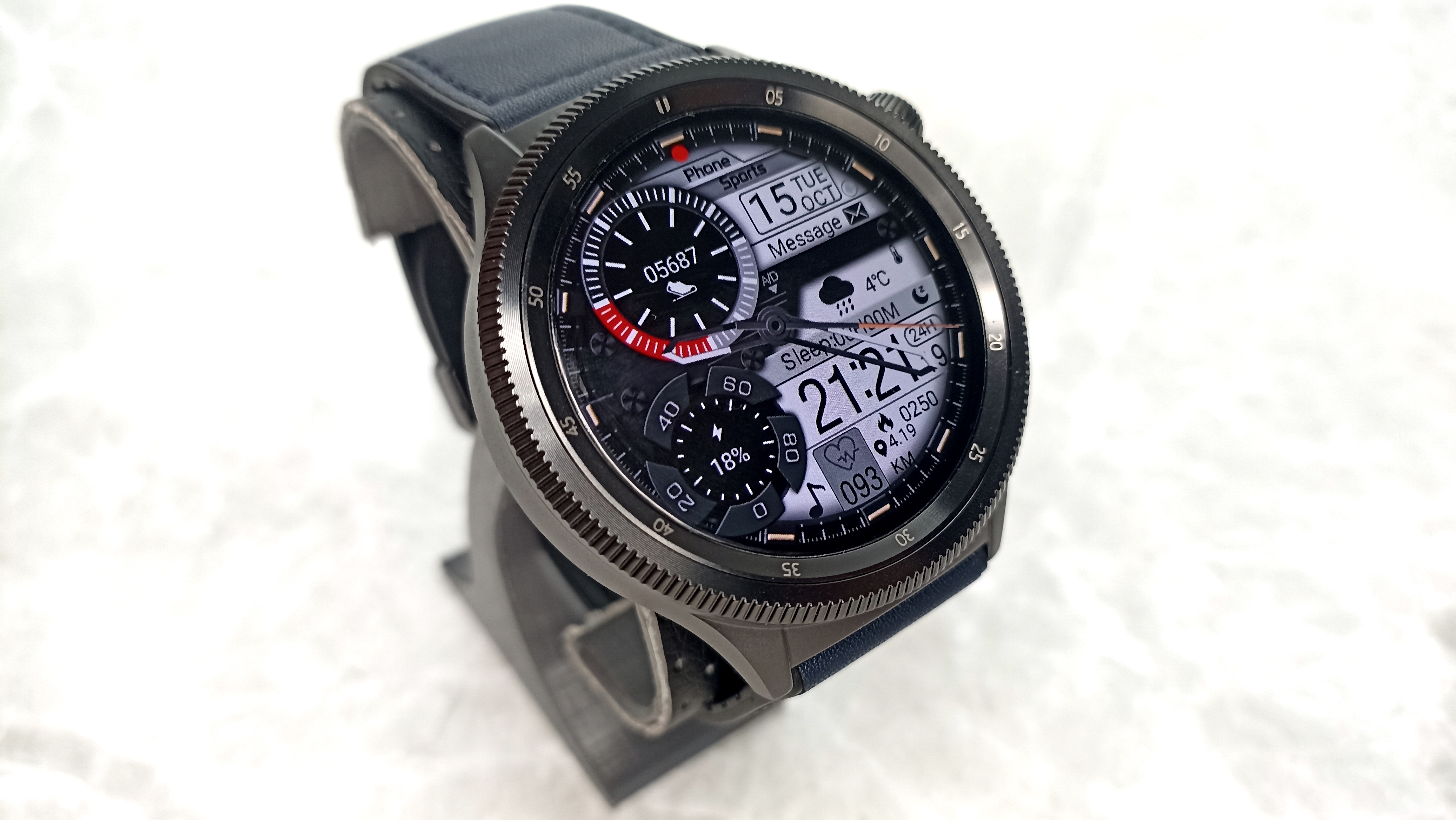 Перейдем с герою обзора. WATCH Gear GT3 — смарт часы в классическом дизайне, круглый 1.43″ экран обрамляет безель шириной 5 мм. Ширина (диаметр) корпуса без учета заводной головки 48 мм, толщина — 13 мм.