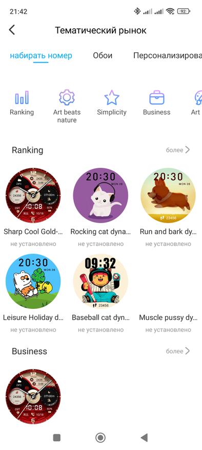 Долгое нажатие на главном экране открывает меню выбора циферблатов. Встроенные скины очень информативные, к тому же имеют некоторые интерактивные элементы — например, быстрый доступ к некоторым функциям.
