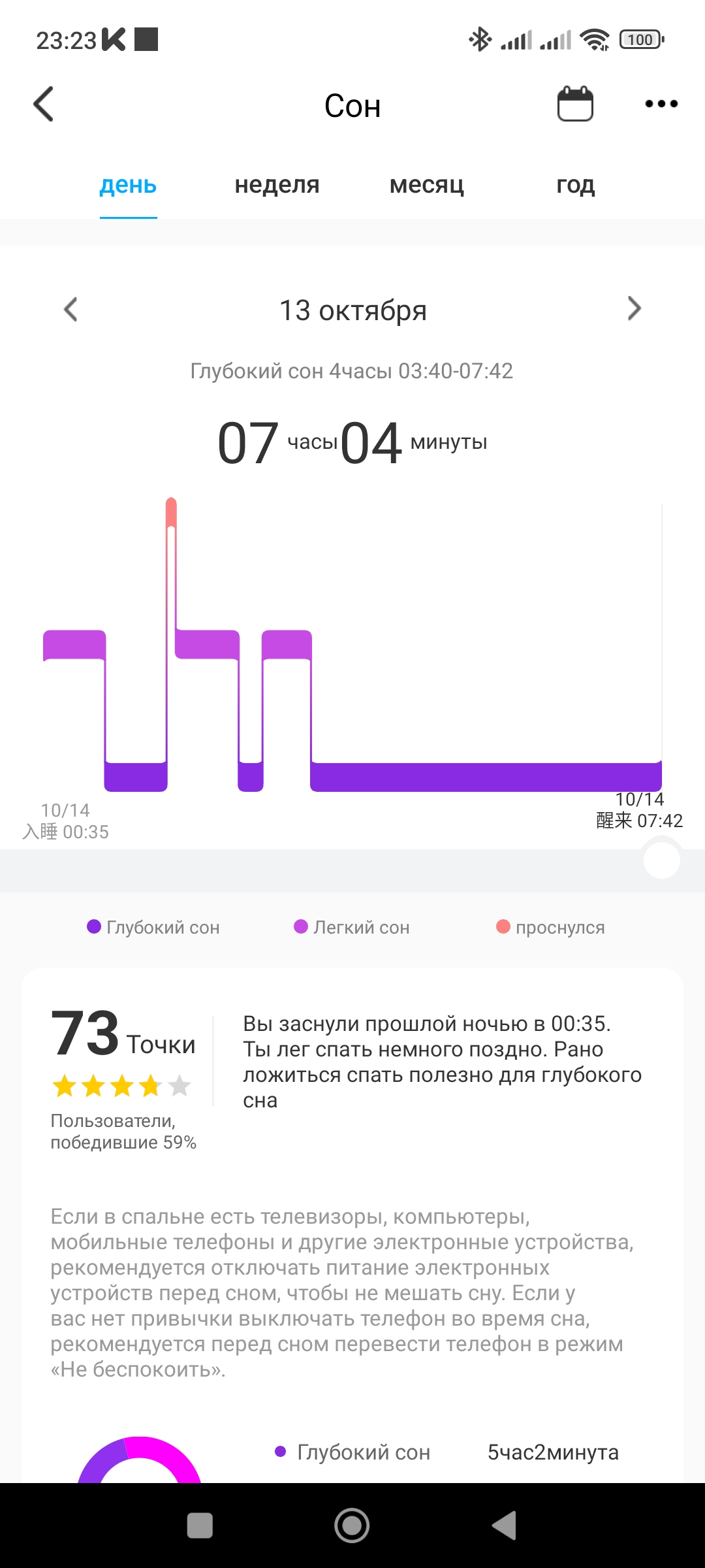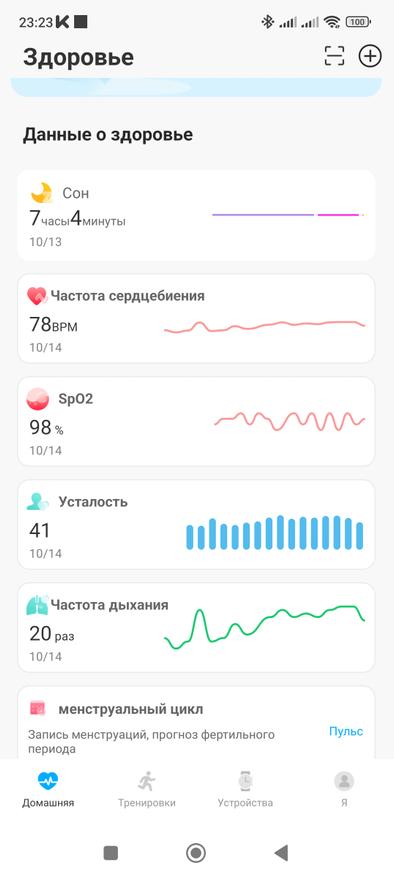 Вся инфографика в KUMI Sports кликабельна, можно посмотреть подробную статистику физической активности и показателей здоровья. Здесь учитываются частота сердечных сокращений, уровень кислорода в крови, усталость, частота дыхания, данные о сне, менструальные циклы. Доступна подробная статистика по количеству шагов и пройденной дистанции, объему сожженных калорий. Данные обо всех тренировках сохраняются с подробной статистикой.