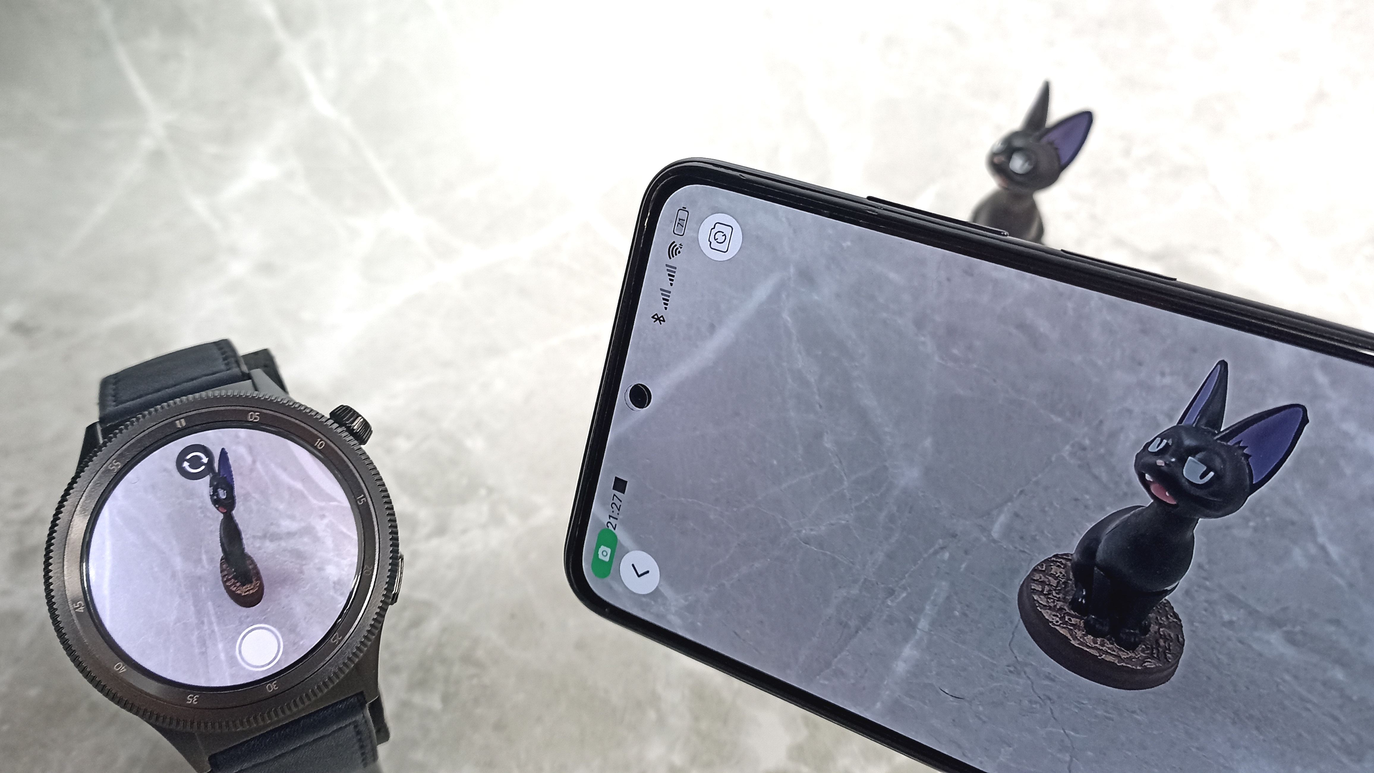 В режиме управления камерой на экране часов отображается картинка в реальном времени. Есть некоторые искажения, поскольку широкоформатное изображение сжимается до квадратного, зато кадр почти не обрезается, что позволит делать более качественные селфи основной камерой.