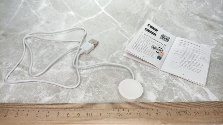 Зарядное устройство представляет собой «таблетку» диаметром 27.5 мм, с вогнутой верхней частью. USB-A кабель мягкий, имеет длину 60 см.