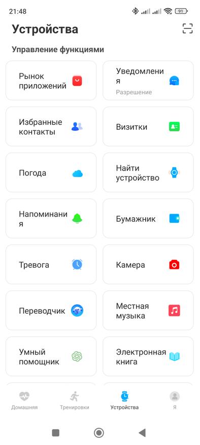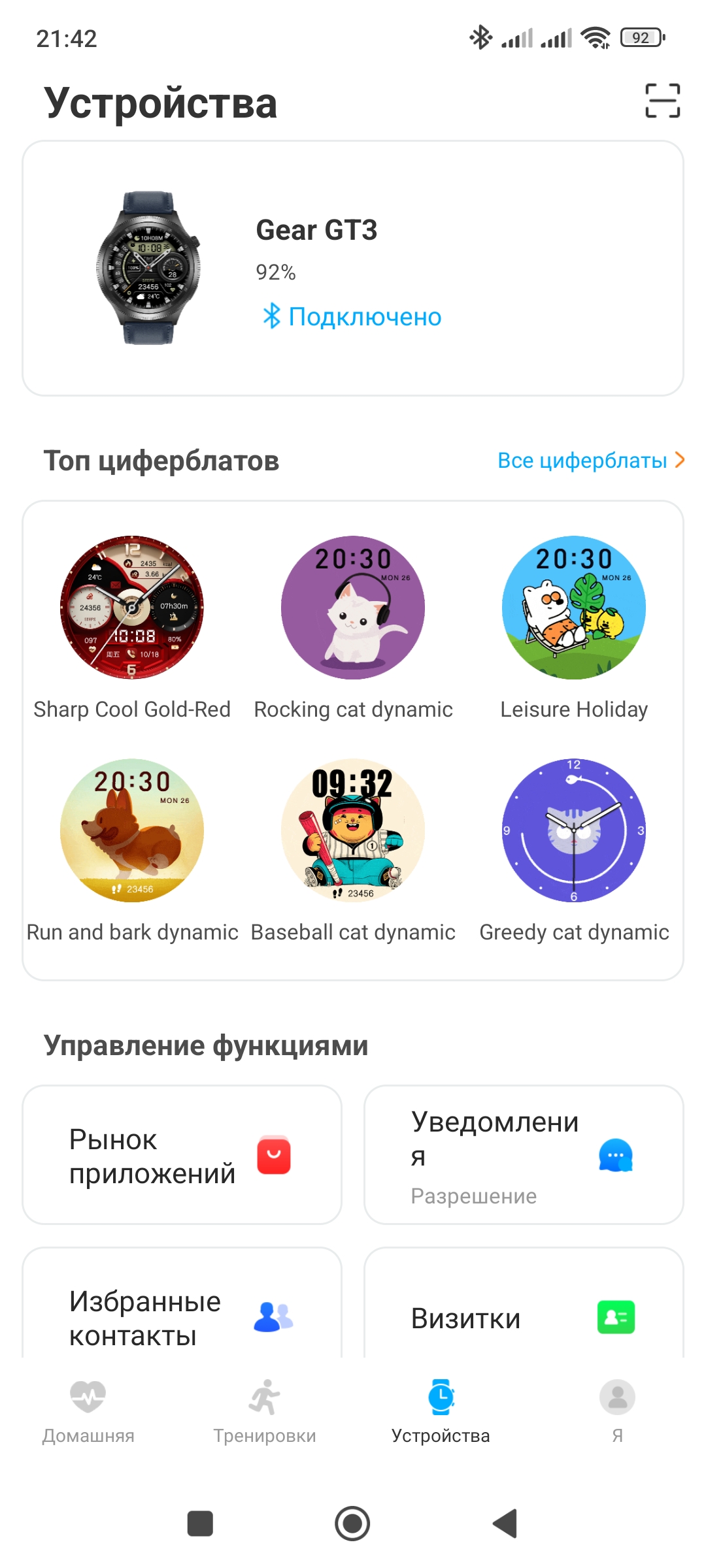 О назначении вкладки «Устройство» догадаться нетрудно — здесь можно настроить часы, выбрать циферблаты или создать свои собственные, установить новые приложения на гаджет, настроить будильники, выбрать избранные контакты