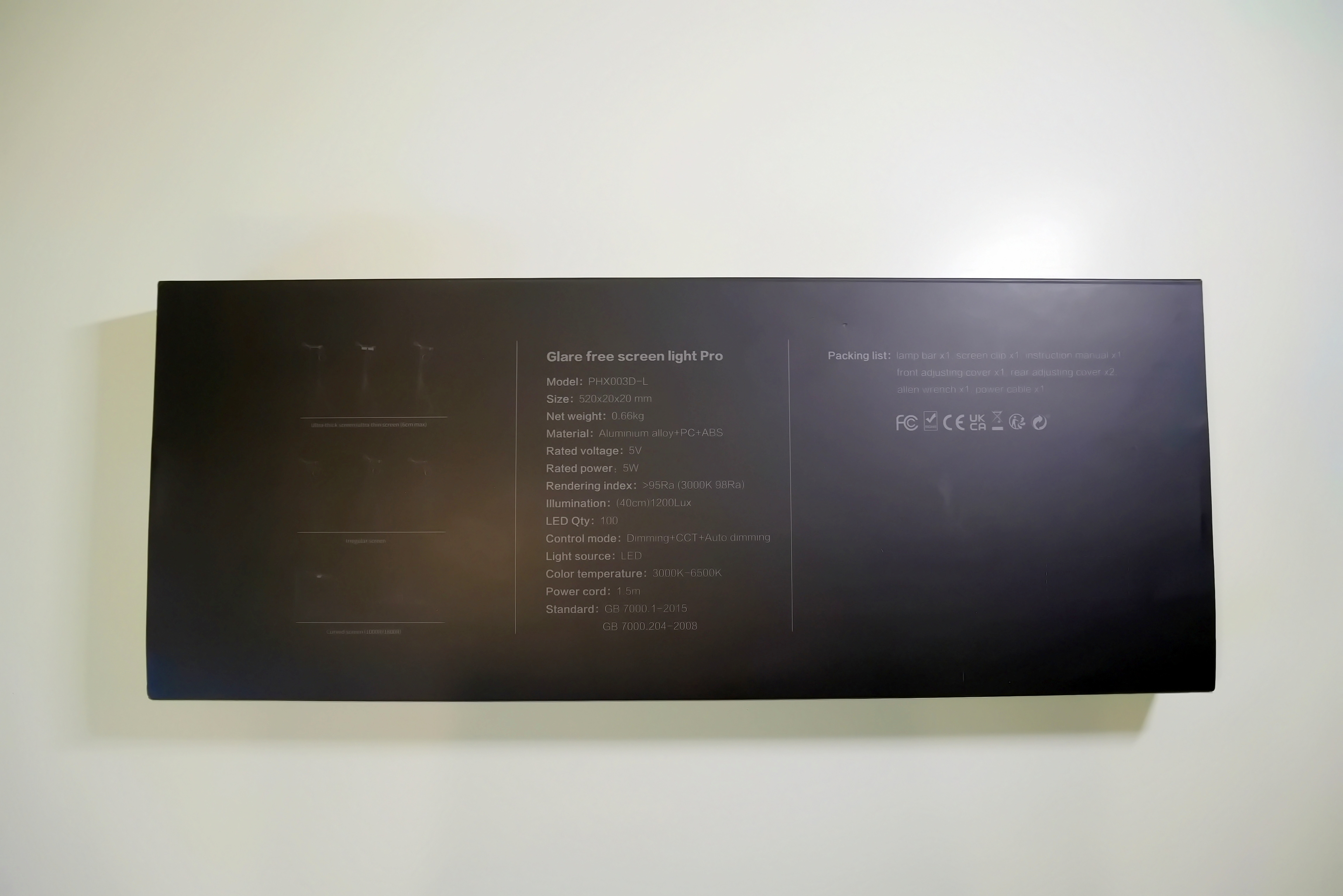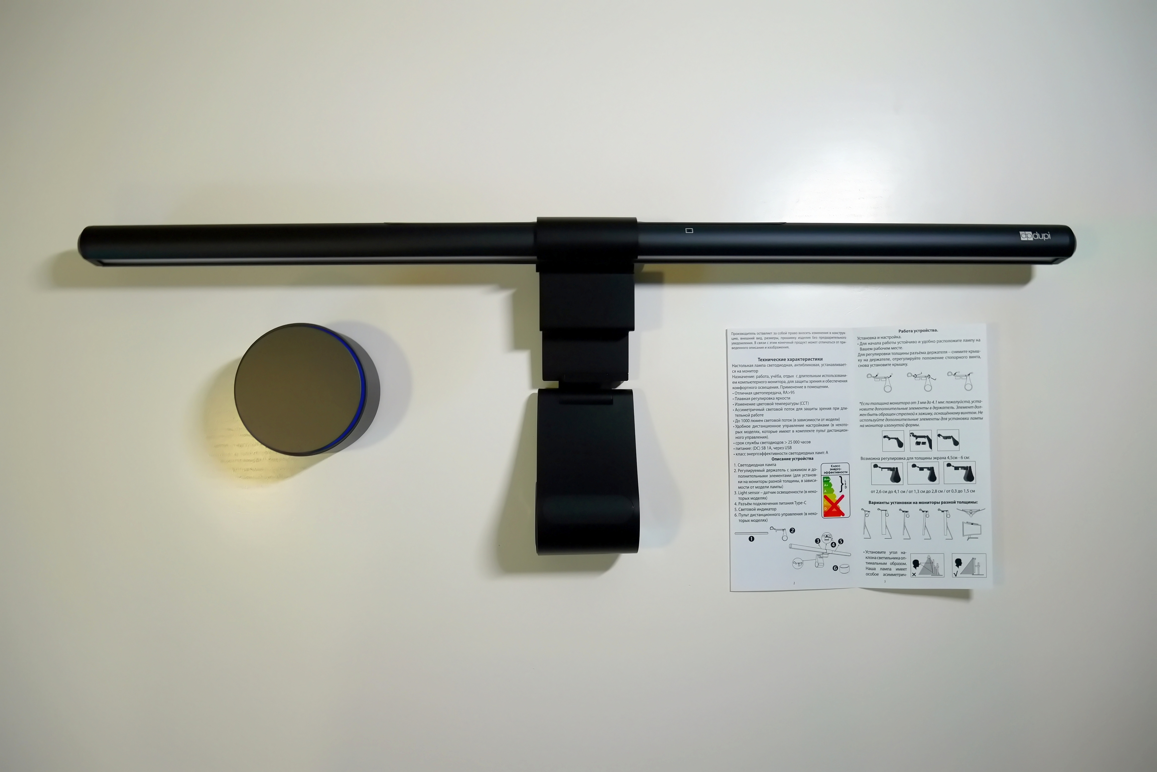 LED лампа поставляется в компактной и стильной упаковке. На передней стороне коробки изображена сама лампа, а на обратной — ее технические характеристики и варианты крепления на мониторе.