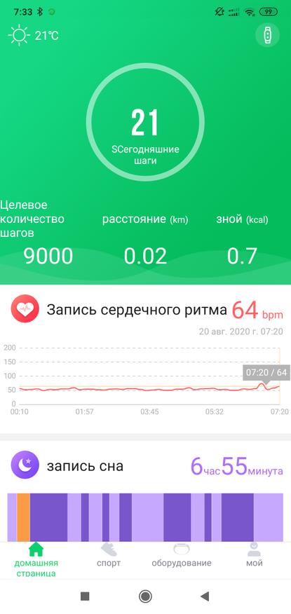 Испытал я и режим тренировки — бег, в нем он показывает время активности, количество шагов и расстояние, которое вычисляет согласно росту пользователя. Минусом является то, что шаги тренировки не идут в общий зачет дневных шагов.