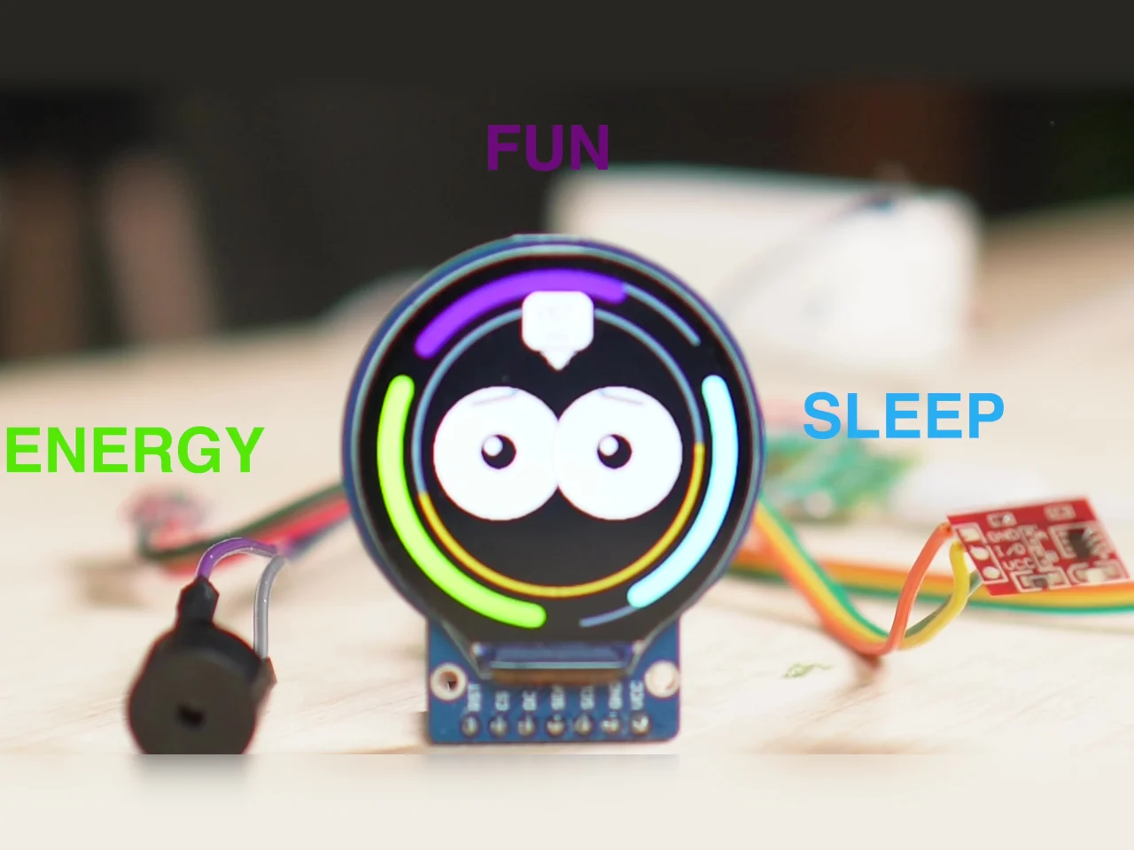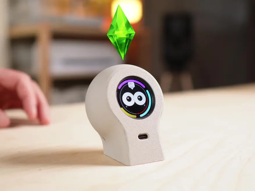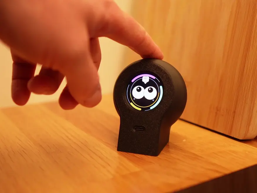 Устройство представляет собой компактный гаджет с круглым цветным дисплеем, на котором отображается анимированное лицо с выразительными глазами. Аппаратная часть включает в себя плату микроконтроллера, сенсорные датчики прикосновения, датчик освещённости и встроенный аккумулятор.