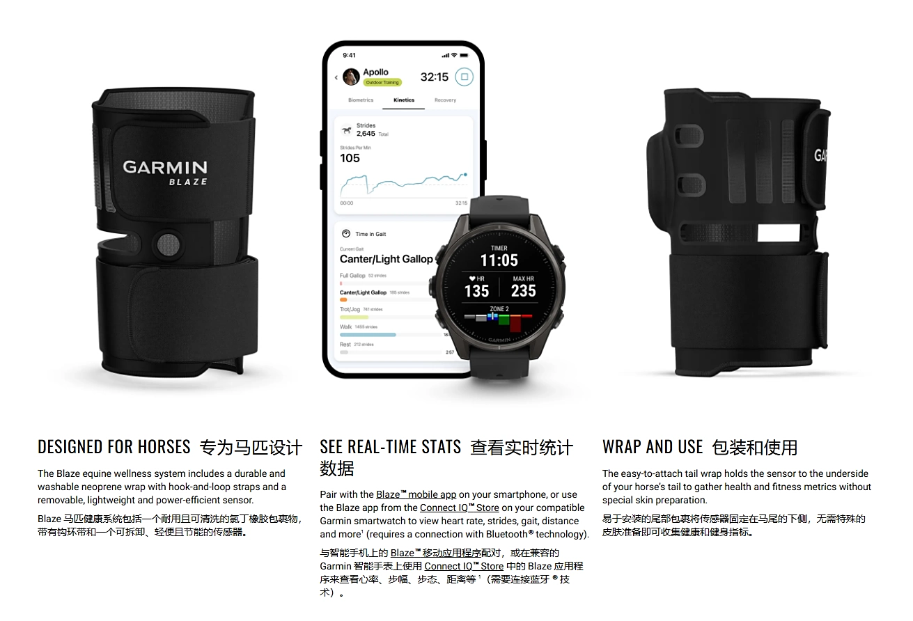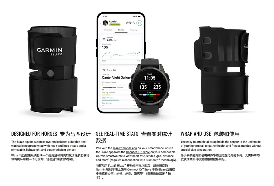 Американская компания Garmin выпустила свой первый носимый трекер Blaze, разработанный специально для мониторинга здоровья лошадей. Устройство весом 74 грамма крепится на хвосте животного с помощью нейлонового чехла с двумя застежками и съемным датчиком.
