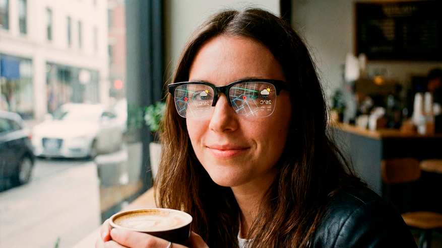 - Вторая модель куда амбициознее и ближе к фантастике, которую нам обещали в начале 2010-х. Эти очки оснастят встроенным в линзу дисплеем (HUD — heads-up display). Технология позволит выводить полезную информацию прямо перед глазами пользователя: от пошаговой навигации до субтитров с переводом иностранной речи в реальном времени. При этом вся тяжелая вычислительная работа будет делегирована подключенному смартфону, что позволит сохранить очки легкими и элегантными.