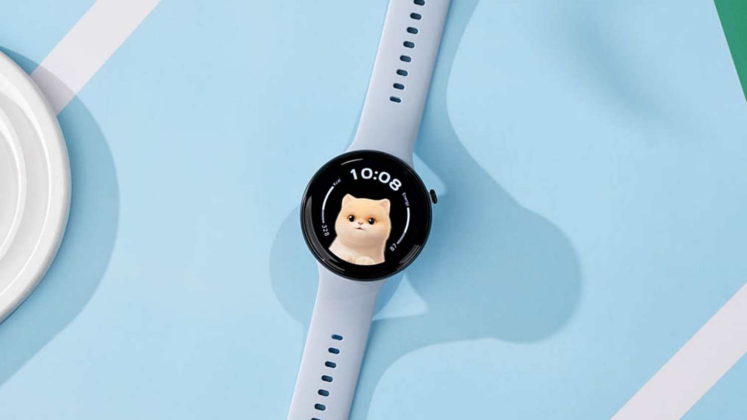 На изображениях видно, что часы имеют круглый изогнутый циферблат с небольшой заводной головкой на правой стороне. Силиконовый ремешок выполнен в голубом цвете, а на экране отображаются время, данные о сжигании калорий, уровень энергии и изображение анимационного животного. Дизайн устройства внешне напоминает линейку Google Pixel Watch.