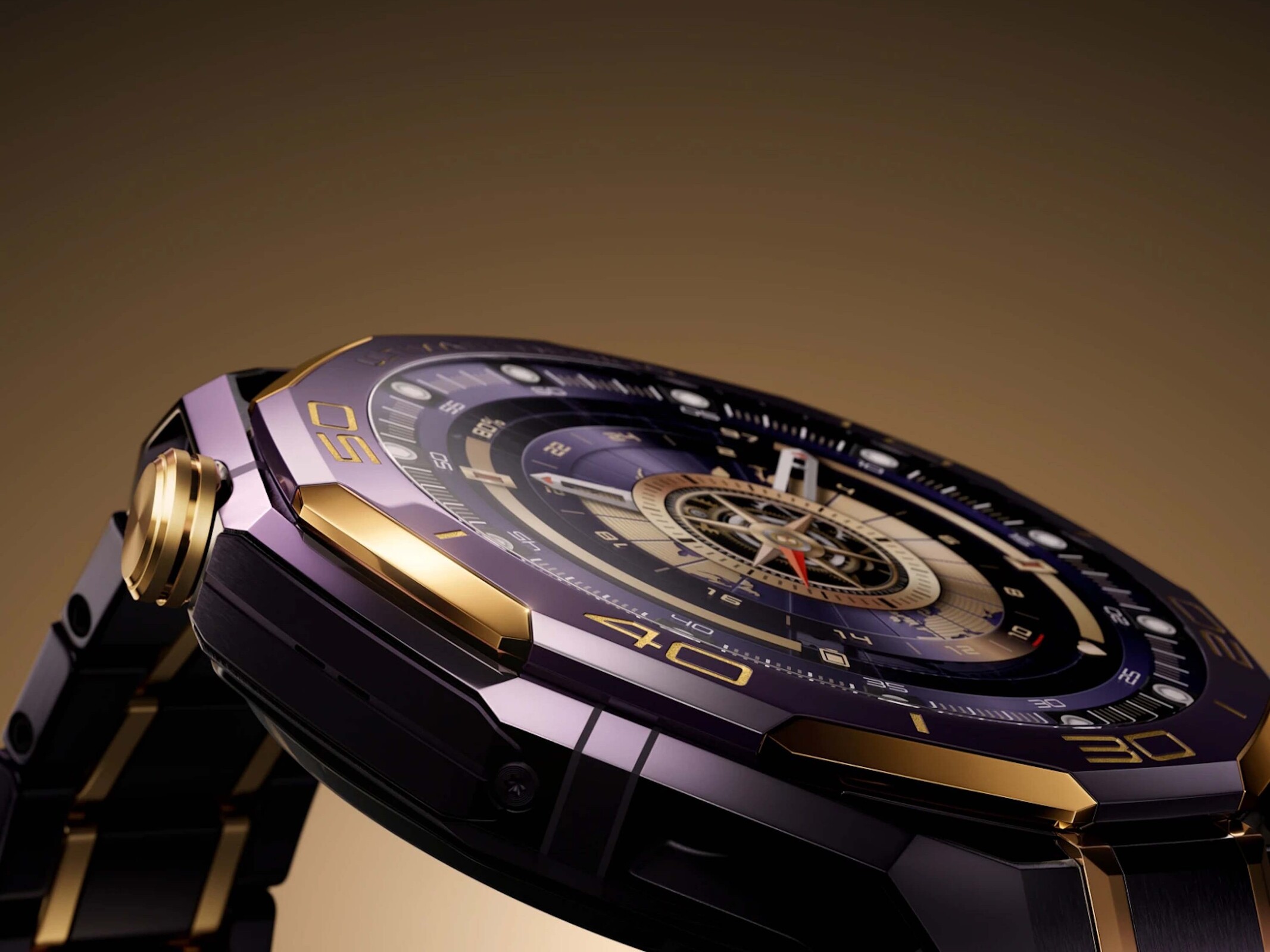 Корпус часов изготовлен из жидкого циркониевого сплава с полой структурой, что обеспечивает сочетание прочности и лёгкости. Дисплей защищён сапфировым стеклом. В комплекте идёт ремешок из титанового сплава в фиолетово-золотом оттенке.