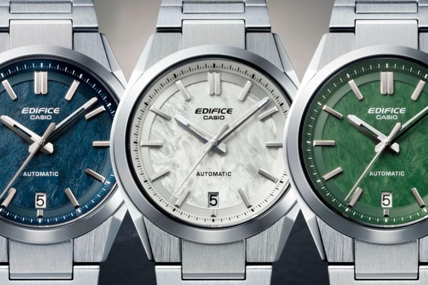 Дизайн сохраняет минимализм Edifice: текстурированный циферблат, напоминающий мрамор, классическая надпись Casio, небольшое окошко даты и строгий корпус толщиной около 10 мм. Модель будет доступна в трёх цветовых вариантах, включая версии с карбоновым корпусом и каучуковым ремешком. Водонепроницаемость — 100 метров, что соответствует стандартам линейки.
