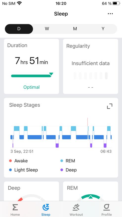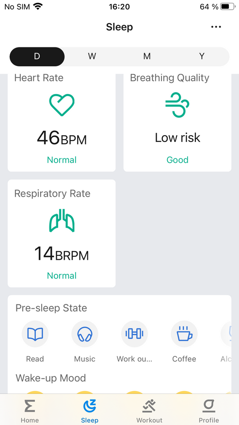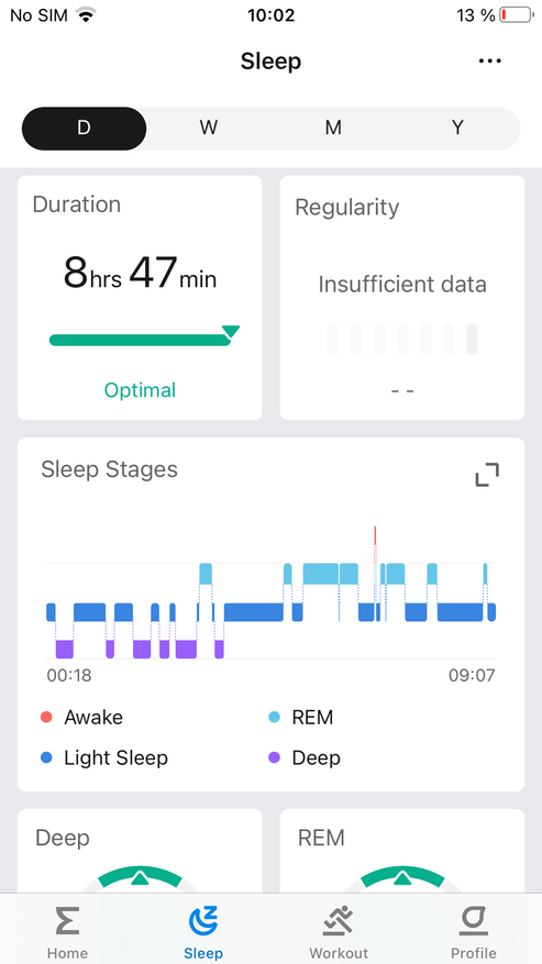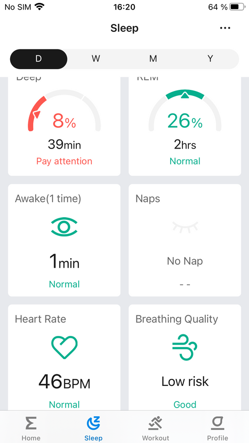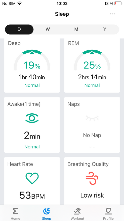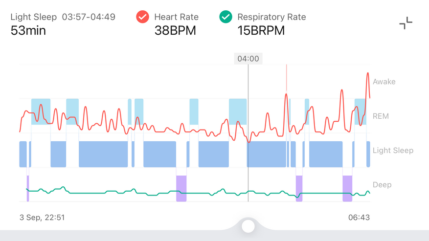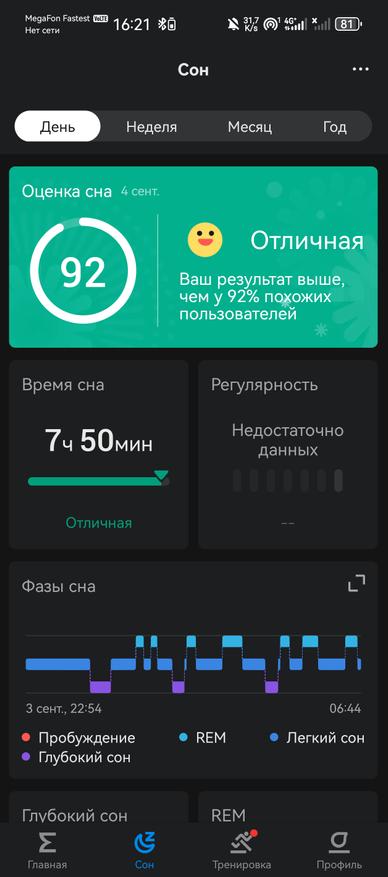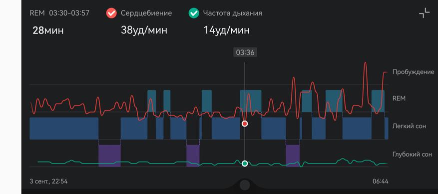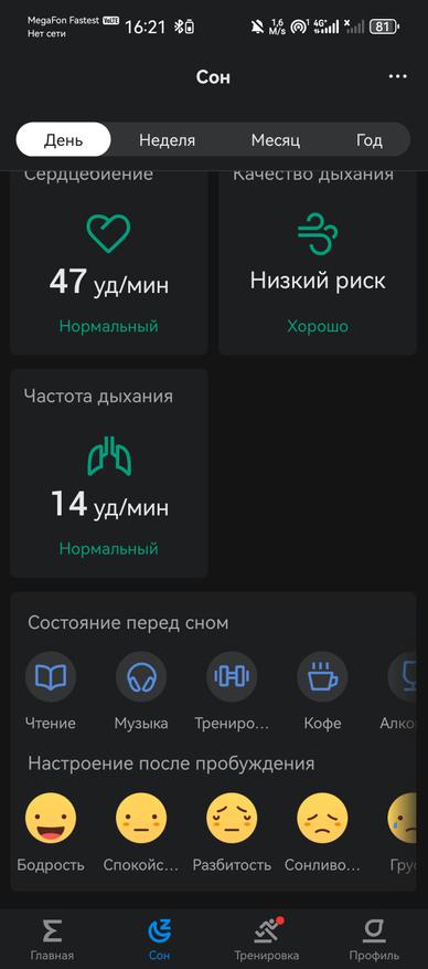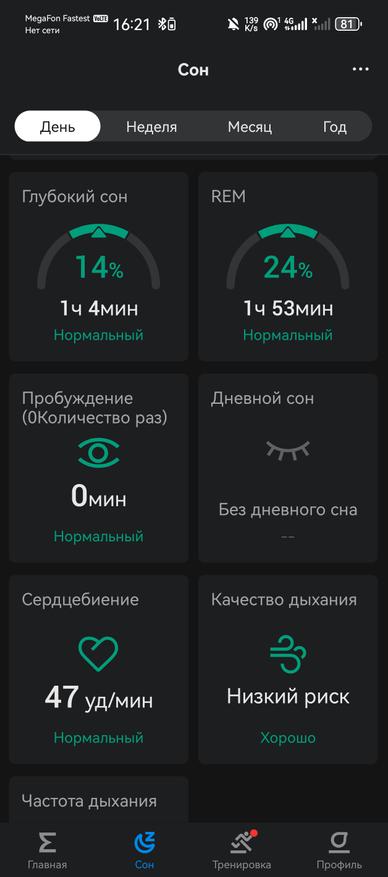 По результатам сна, даётся оценка показателя, а также оценки времени каждой стадии с описательной характеристикой: «Хорошо» или «Плохо». Мне нравится, когда стадии сна изображаются с динамикой пульса и, как в случае часов Amazfit, ещё и с количеством вдохов/выдохов. Такой график доступен при развороте изображённого на втором скриншоте на весь экран.