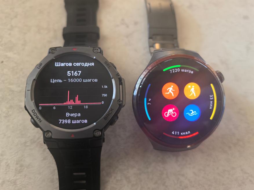 Ходил с HUAWEI Watch 4 Pro SE и Amazfit T-Rex 3 полдня. Это меньше, чем провожу тест на количество шагов за день, но разница в шагах двух часов была большой уже на этом интервале — 2053 шага. Во время теста смотрел на данные, разница сначала была 500, потом 1000 шагов и на середине дня прекратил тест. По результатам дня количество шагов было: