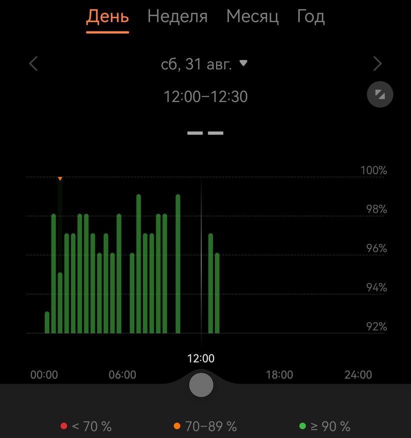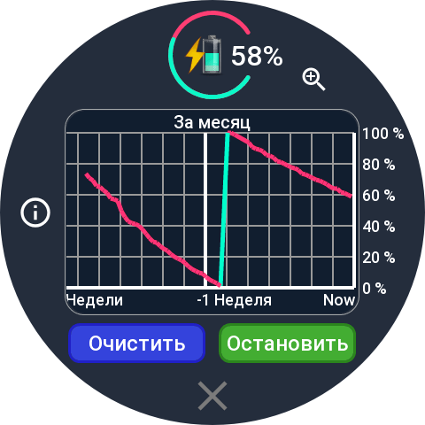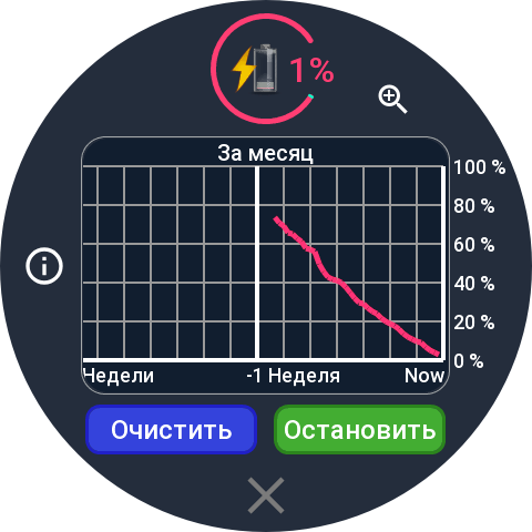 У меня получилось разрядить часы как раз за 8 дней, но в первый день у меня был самый большой разряд за период — около 30%, как сказал выше (на графике этих 30% не видно, так как после переустановки данные не сохранились). В последующие дни у меня тратилось до 16% при автоматически определенной тренировке («Ходьба») и в крайние дни — по 8-10%, когда таких тренировок не было. Измерялись всевозможные показатели здоровья в автоматическом режиме,