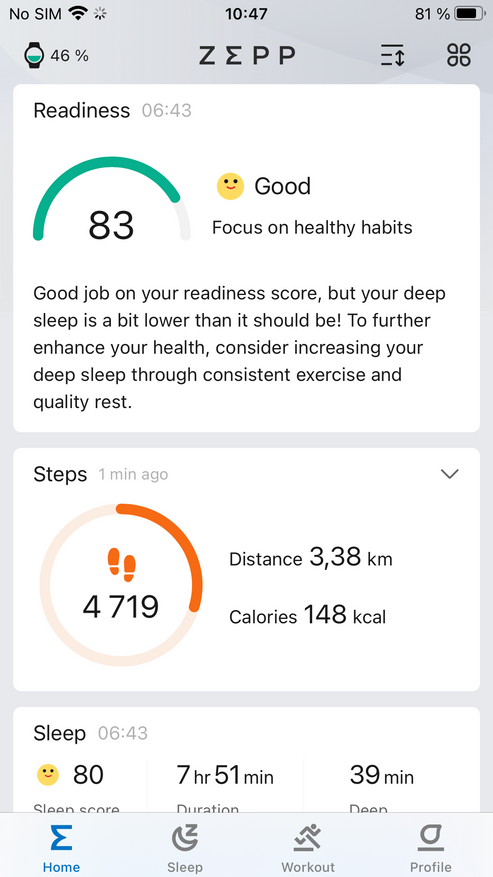 Если к стандартным показателям пульса, кислорода, стресса, сна вопросов нет, то дальше у смарт- и фитнес-часов начинаются отличия. Единственные умные часы, которые могут отслеживать более 4 показателей за одно нажатие — это HUAWEI, к примеру модель Watch 4 Pro (обзор здесь). Обозреваемые делают это только по 4 метрикам здоровья, что не отличает их от аналогов. Часы Amazfit показывают себя «не как по рынку» дополнительными возможностями в приложении. Начиналось это с цифрового тренера (Zepp Coach), потом добавились Zepp Aura, как подготовка ко сну, после — голосовой помощник Zepp Flow, который заменяет Amazon Alexa.