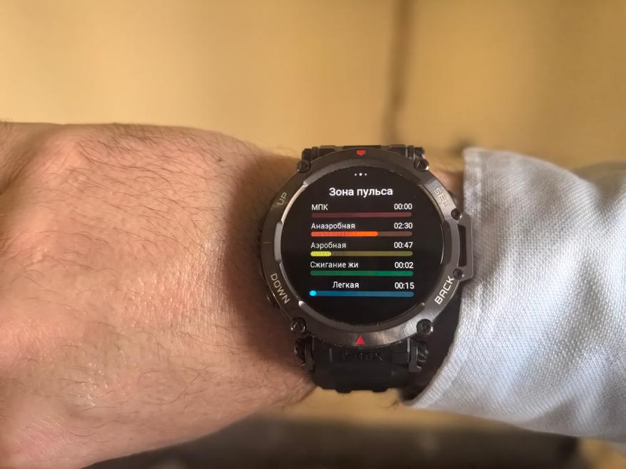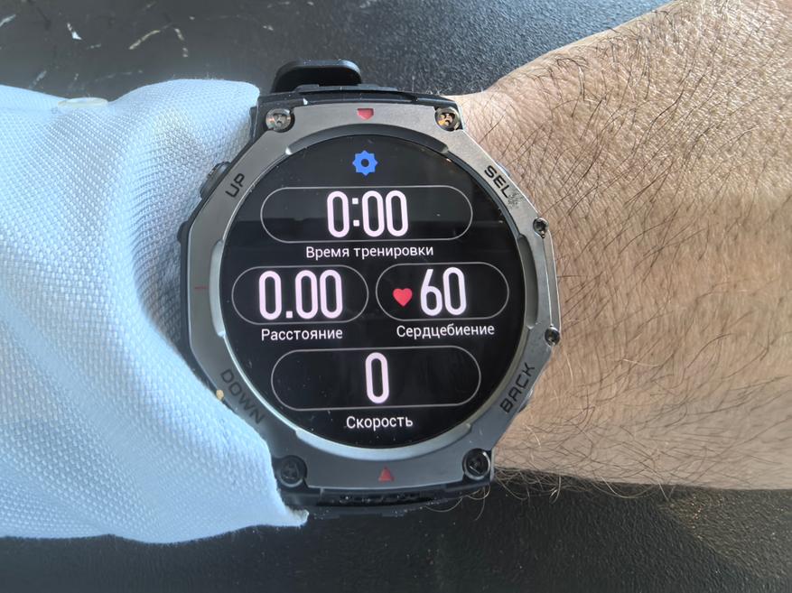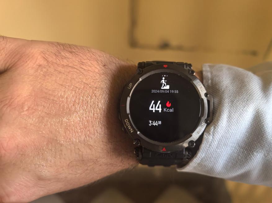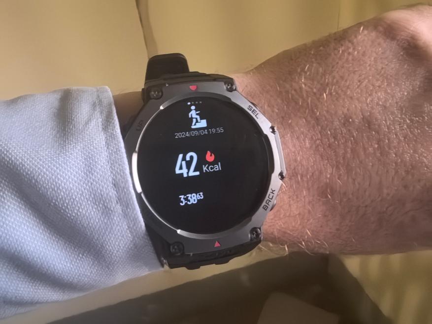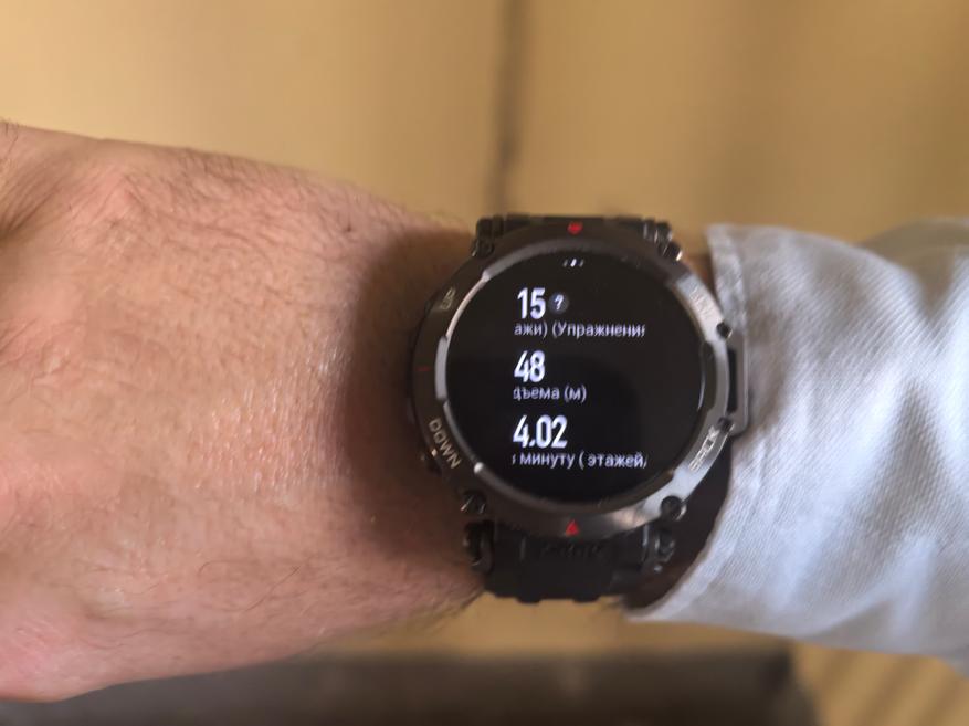 Спортивных режимов всего 177 шт. Они разделены на категории: «Бег и ходьба» (8 тренировок), «Велосипедная езда» (11), «Плавание» (4, в бассейне, на открытой воде, скоростное подводное, синхронное), «Тренировки на улице» (11), «Тренировки в помещении» (27), «Танцы» (16), «Единоборства» (12), «Игры с мясом» (33), «Водные виды спорта» (13), «Зимние виды спорта» (13), «Экстремальные виды спорта» (3, парапланеризм, вингсьют полет, прыжки с парашютом), «Рекреационные» (12), «Настольные и карточные игры» (5), «Ныряние» (3, в водоеме до 45 м, в бассейне, подводная рыбалка), «Другие виды спорта» (7, триатлон, многоборье, подъем по лестнице и др.). Из поддержки спортивных тренировок, в T-Rex 3 можно плавать, нырять, но нельзя подвергать резкому перепаду давления и выходить из жары сразу в холод, так как резкие скачки температуры вредны не только технике, но и человеку. Для меня один из интересных спортов — это «Подъем по лестнице». В рамках дневной статистики часы показывают количество пройденных этажей и считают их при занятии соответствующим спортом.