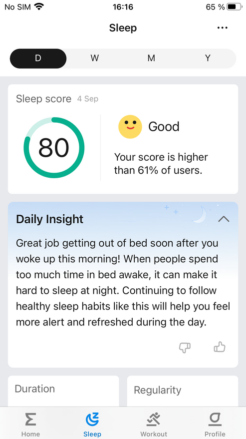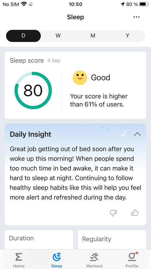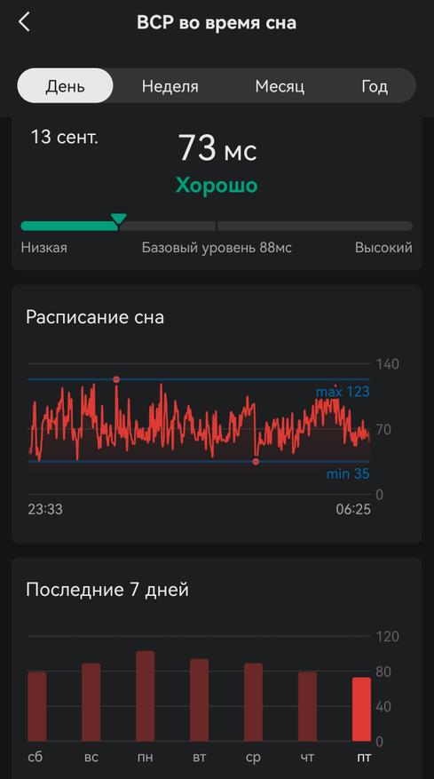 Вариабельность пульса (разница следующего и предыдущего значения пульса) определяется на основе графика пульса за ночь. Полученному среднему значению даётся характеристика: «Низкая», «Базовый уровень», «Высокая» — судя по линии. В моем случае значение было «Оптимально», но через 9 ночей система определила базовый уровень для меня и уже с ним сравнивало последующие значения. Как сказал выше, в китайских часах Dido G28S Pro из данного показателя получают кривые Лоренца, но у Amazfit такого нет.