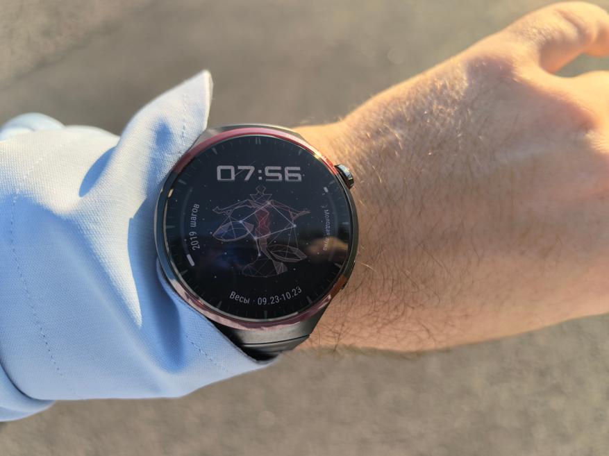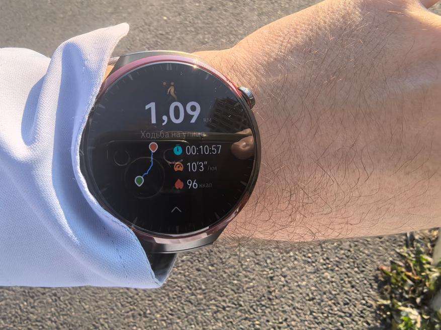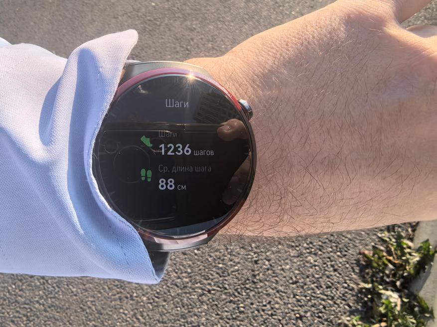 Ещё один пример сравнения обозреваемых и часов HUAWEI на утреннем солнце на полной яркости показал ниже. На экране обозреваемых информация считывается лучше.