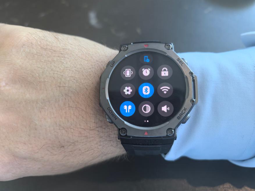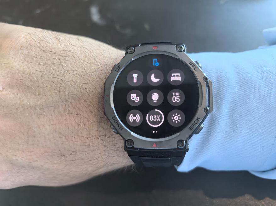Меню быстрых действия находится по сдвигу вниз. В него можно уместить 18 иконок. В часах нет динамика, но есть настраиваемый зуммер, который издает звук на некоторые события. Громкость данного бипера можно настроить из меню быстрых действий. Необычно слышать звуковое оповещение, учитывая, что в Amazfit T-Rex 3 нет динамика. Чтобы сигнал бипера распространялся на будильник, надо включить в Настройках — Звук и вибрации — Сцены с зуммером — «Другие», кроме уже активной опции «Тренировки» (или отключить их обе). Сигнала не будет на Сообщения, Телеграм, YouTube, но будет на будильник, звонок.
