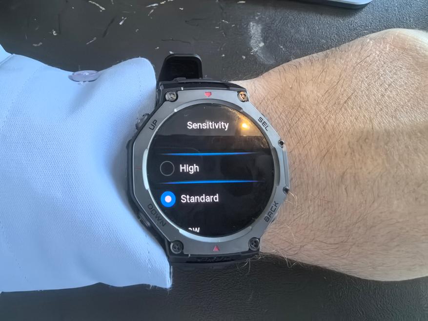 Экран у спортивных часов отзывчивый, реагирует на движение запястья быстро. Задержка не ощущается. Есть два режима работы: «Нормальный» и «Высокий». Немного быстрее просыпается дисплей при поворотах во втором, но при незначительных шевелениях рукой, для посмотреть время, повернув ее против часовой стрелки, не загорается. В других умных часах я не встречал выбора скорости отклика дисплея. Тем не менее всегда пользуюсь на T-Rex 3 первым режимом.
