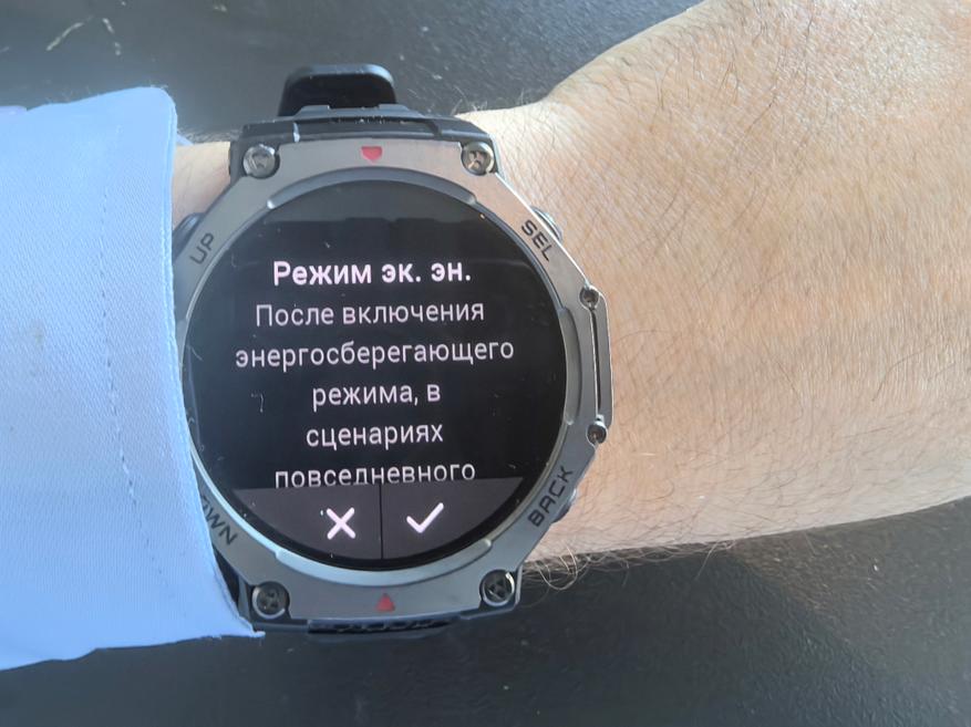 Переключение в режим «Увеличенной автономности» происходит через вызов меню быстрых действий и нажатия на оставшийся заряд аккумулятора (или через Настройки — Предпочтения — Режим экономии энергии). Появится сообщение, что все опции по пульсу, кислороду, стрессу, сну будут отключены. При использовании только GPS в таком энергоэффективном режиме, обещают, ёмкости батареи хватит на 180 ч.