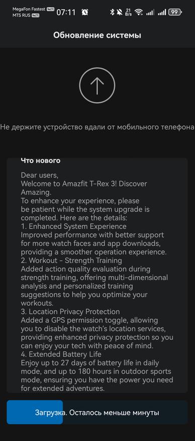 Я поставил оценку показателей здоровья на самый минимальный интервал получения данных (1 мин). Во время использования «прилетело» два обновления. Второе добавило опцию «Силовой тренировки» (Strength Training) и увеличенный режим автономности до 27 дней.