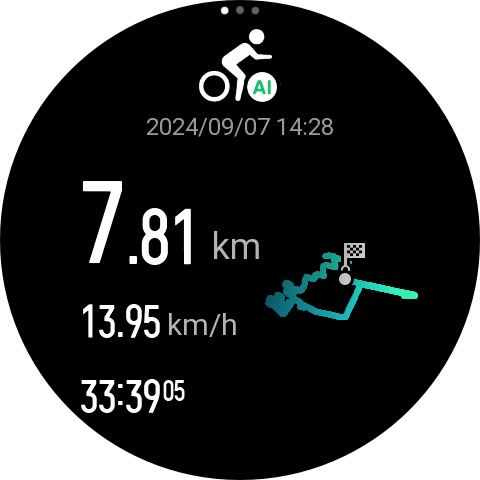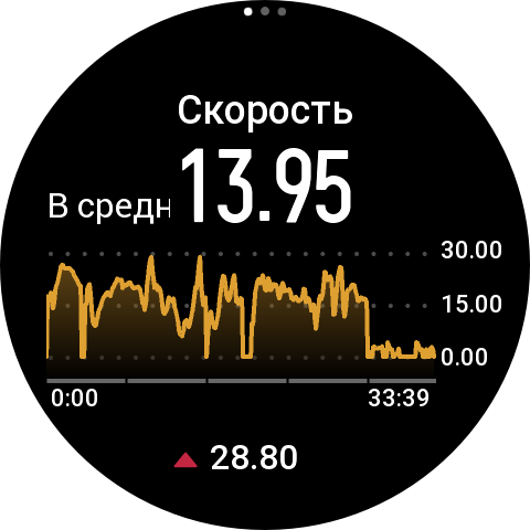 Начал тренировку без ручного выбора активности. Тренировка распозналась за 80 с, как «Велосипед». Скорость движения к этому моменту составила 25 км/ч. После окончания стал ждать, когда автоматика сама завершит процесс тренировки. Для этого потребовалось 5 мин. Получается, лучше завершать автоматически распознанные активности самому, а начинаться они могут без участия пользователя. К примеру, в TicWatch Pro 5 Enduro мне потребовалось кататься в течение 8-10 минут, чтобы спорт распознался автоматически и эти 8-10 минут не были отражены в графике, отсчёт спорта начинался с момента распознавания (возможно, что-то поменялось в Pro 5 Enduro с обновлениями).