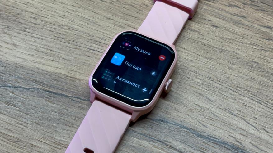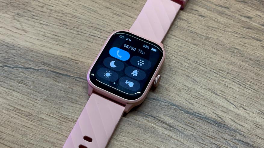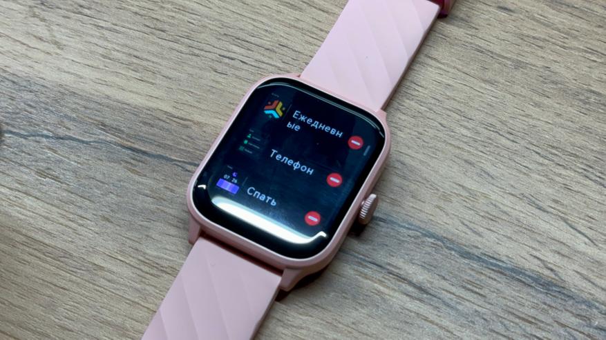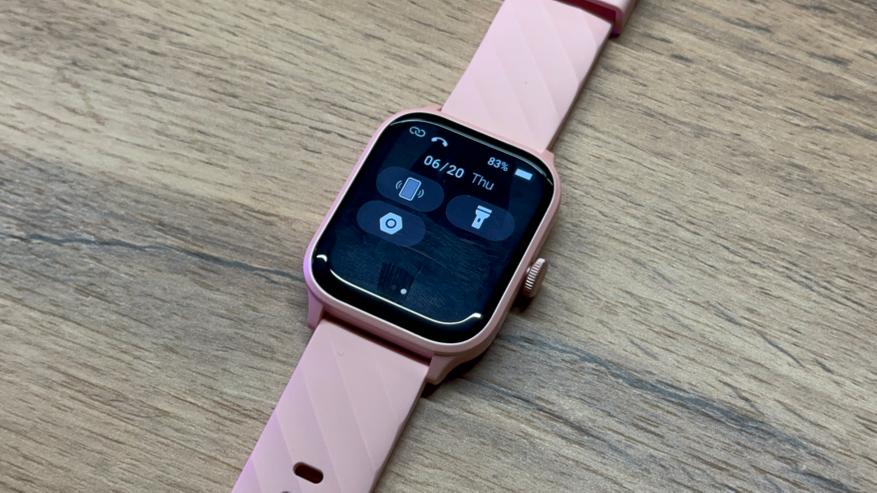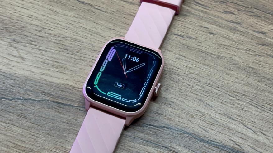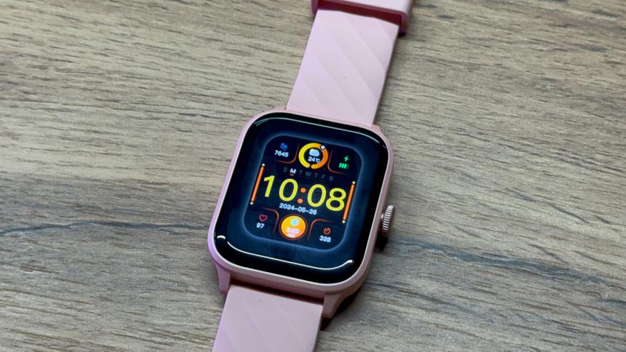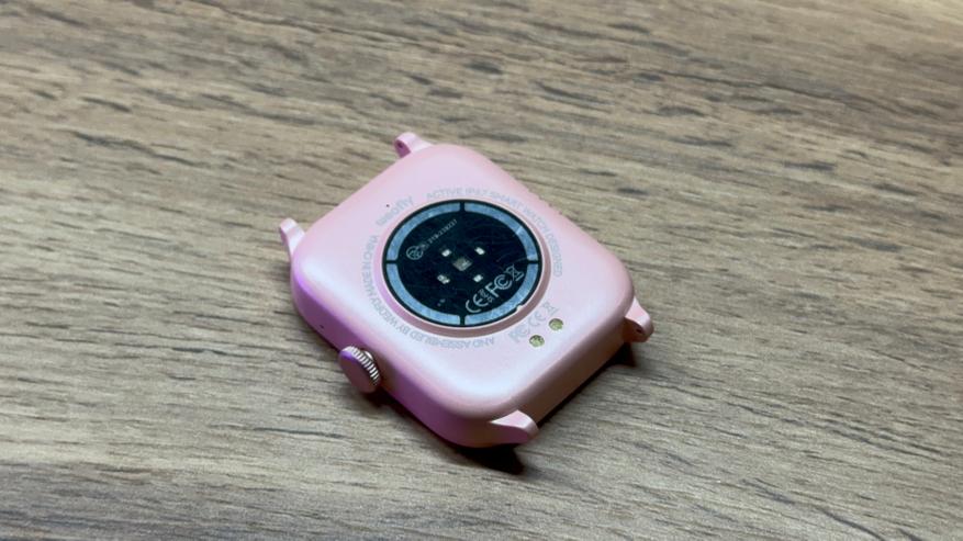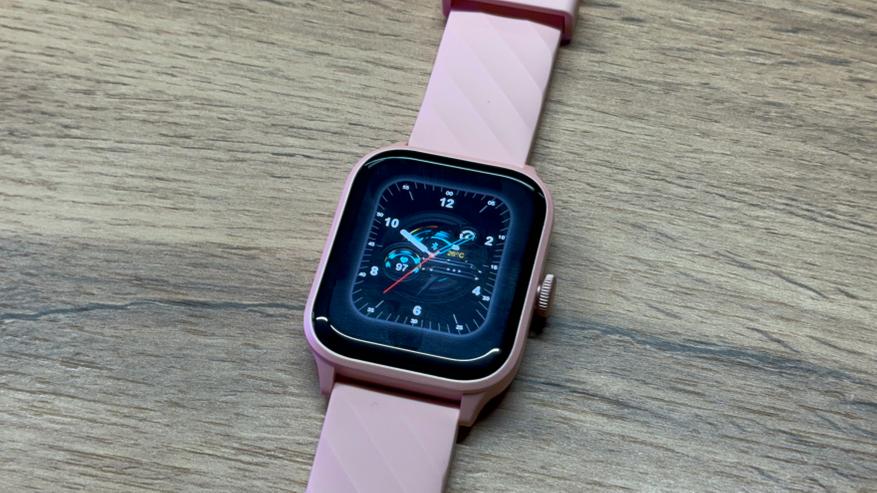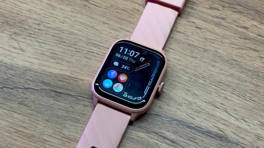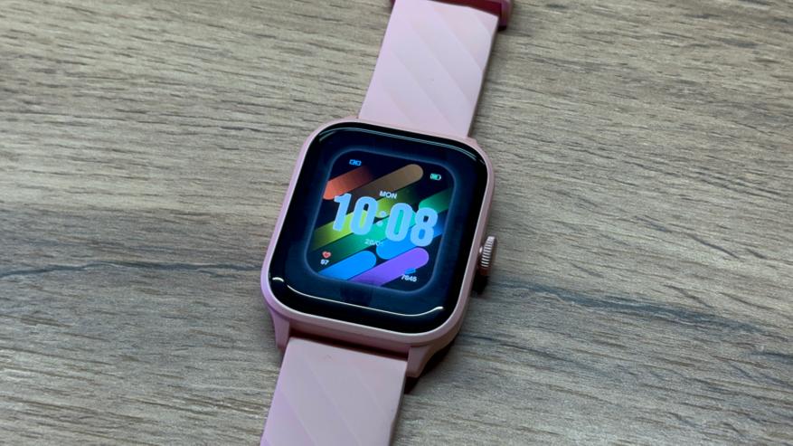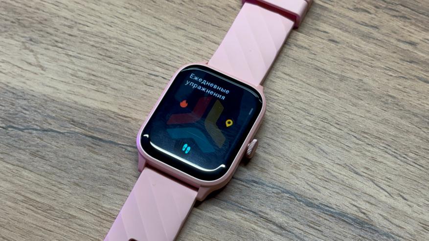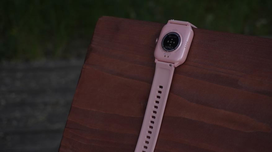 Фитнес-часы продаются в трёх разных расцветках. Все они имеют пластиковый корпус с одной кнопкой для управления на правом боку. Экран диагональю 1.83 дюйма и разрешением 240x280 пикселей достаточно яркий, чтобы оставаться видимым на солнце. У меня под рукой розового цвета.