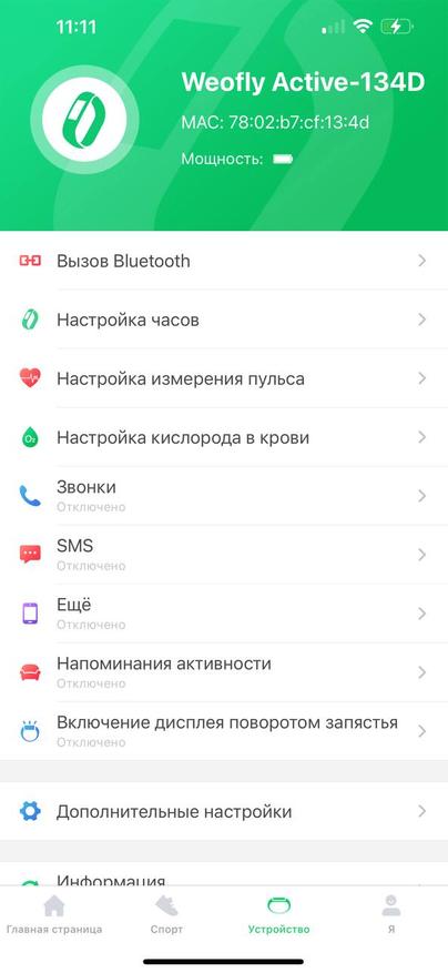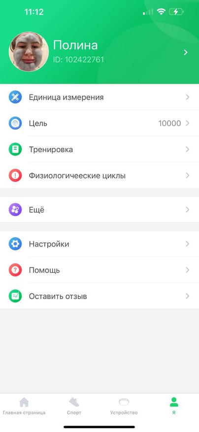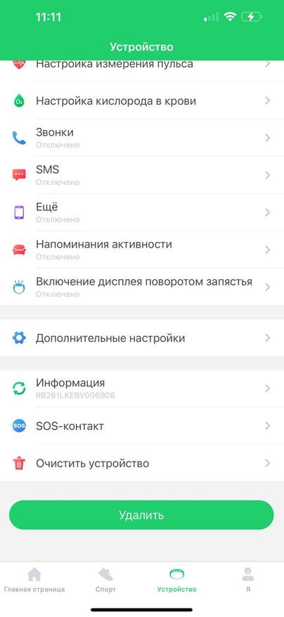 На главной странице приведены все показатели пользователя. Например, пульс, пройденная дистанция и так далее. В следующем разделе «Спорт», как ни странно расположились данные о спорте. Какие были тренировки и во сколько. Мы же сфокусируемся на третьем разделе «Устройство», где пользователю дается возможность настроить часы.