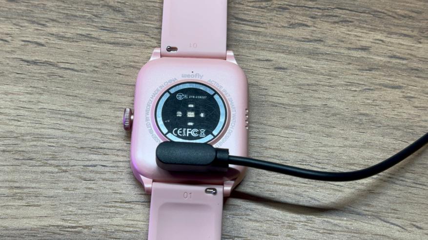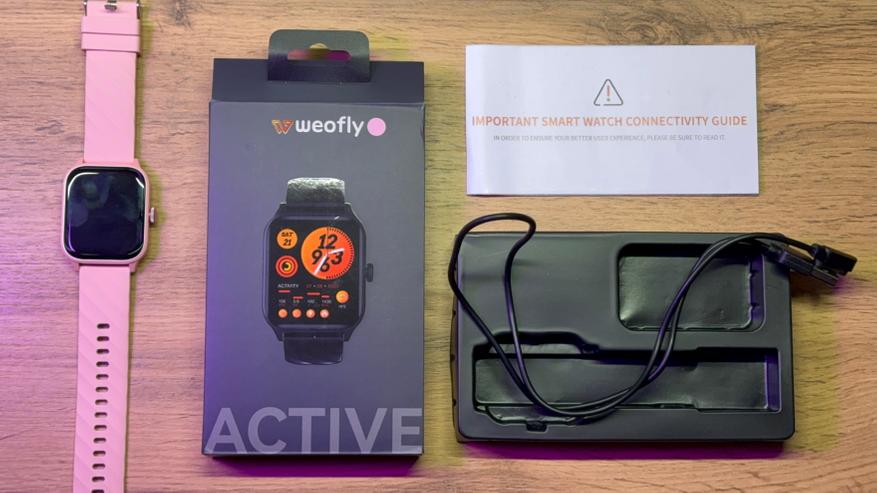 Внутри коробки Weofly Active идут с уже установленным ремешком. Кроме ремешка, в комплекте есть магнитный зарядный кабель, гарантийный талон и инструкция. В инструкции есть раздел на русском языке, оттуда же с легкостью можно скачать приложение для сопряжения с этими часами (о приложении чуть позже).