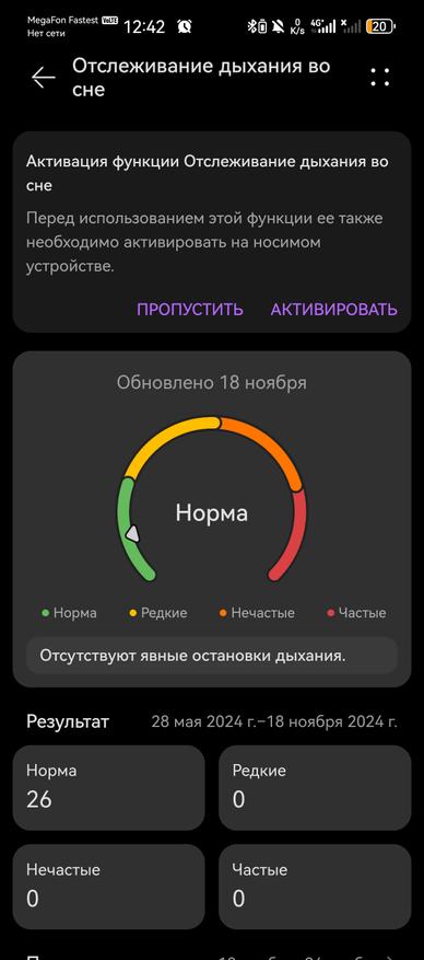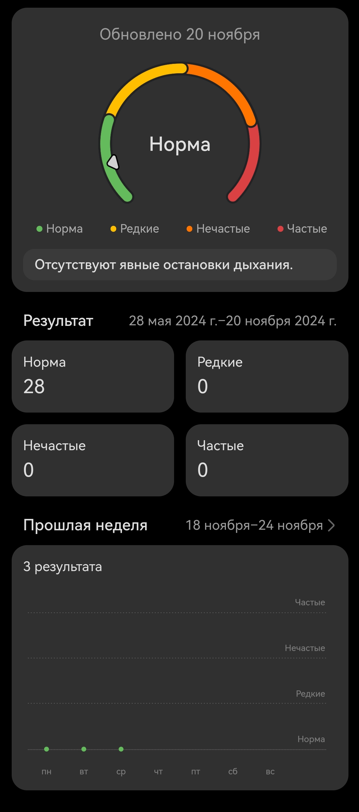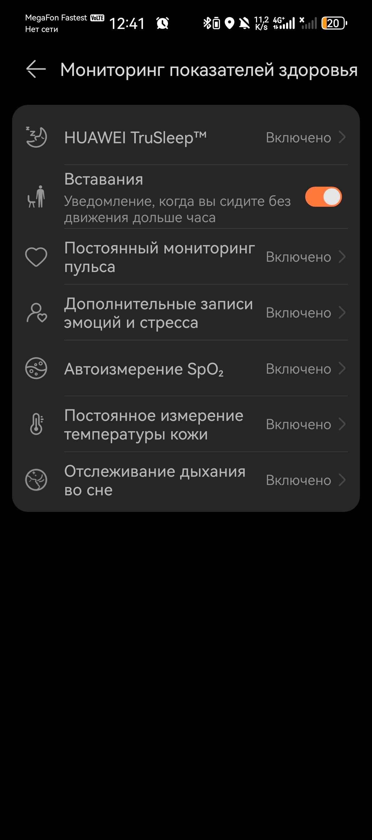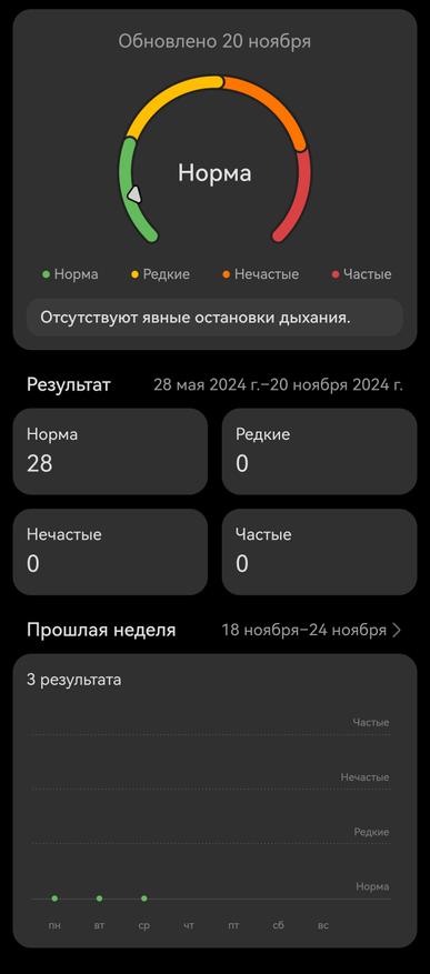 Отдельно показал метрики «Эмоций» и «Стресса». Это программная опция телефона, а не часов, поэтому странно, что ее нет в Watch D2. Как понимаю, она появится с будущими обновлениями на других моделях. В разделе появляется надпись, что будут приходить уведомления о плохом состоянии «Эмоций» и предложения по их налаживанию по средствам проведения дыхательных упражнений, занятий спортом. Мне пока таких оповещений не приходило. По итогам дня предоставляется отчёт об эмоциональном состоянии пользователя. Подход помощи часов в определении состояния пользователя и выдача результатов представляется лежащим на поверхности, но ни один другой бренд его до сих пор не предложил, как минимум я не видел. Ни в TicWatch, ни у Samsung, ни у Amazfit такого не видел. Про часы Apple не знаю.